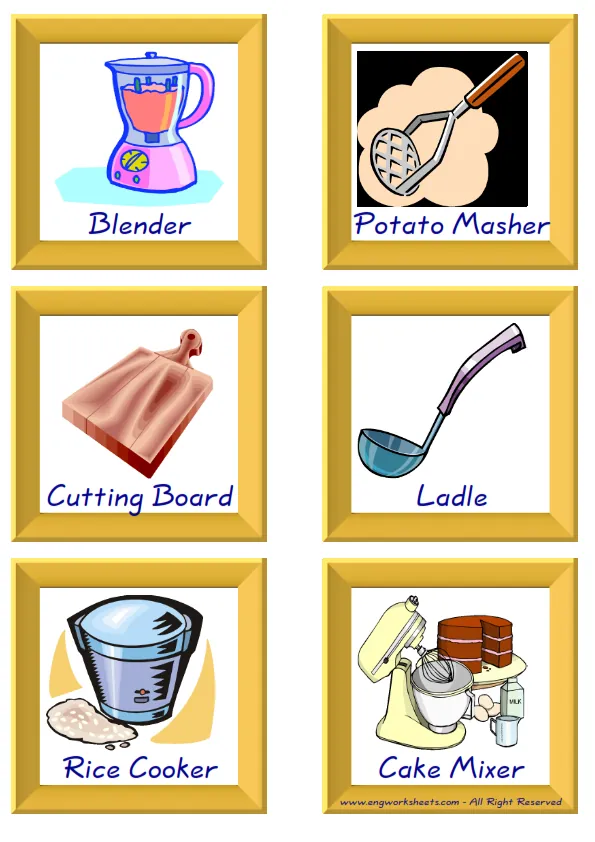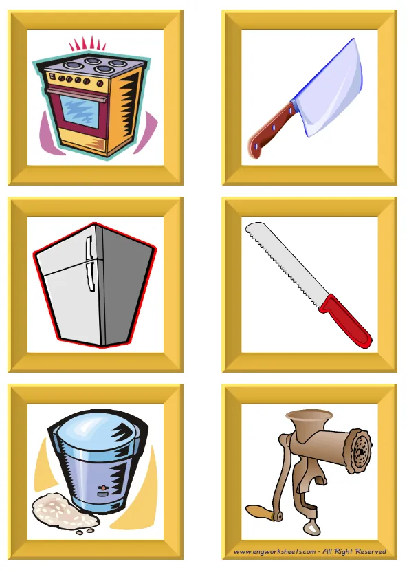 Flashcard pictures of the Kitchen without words provided with four images on a page. You can print our worksheet prepared using Kitchen pictures in A5, A4, or A3 size and use it for recall in your classroom or at home.