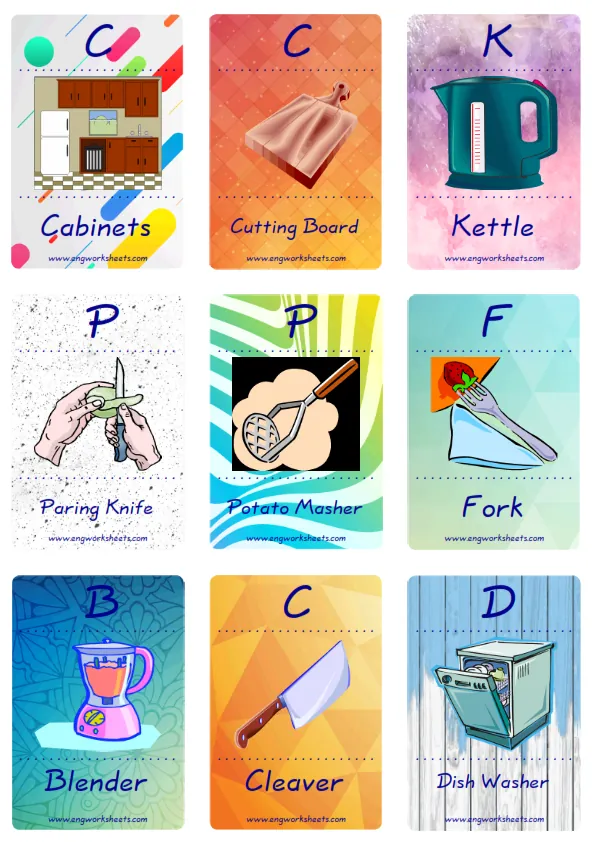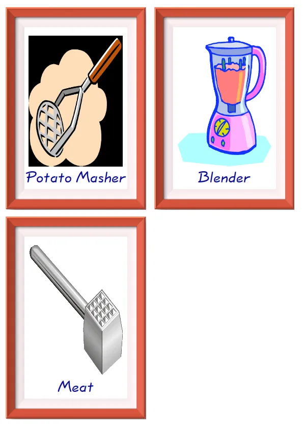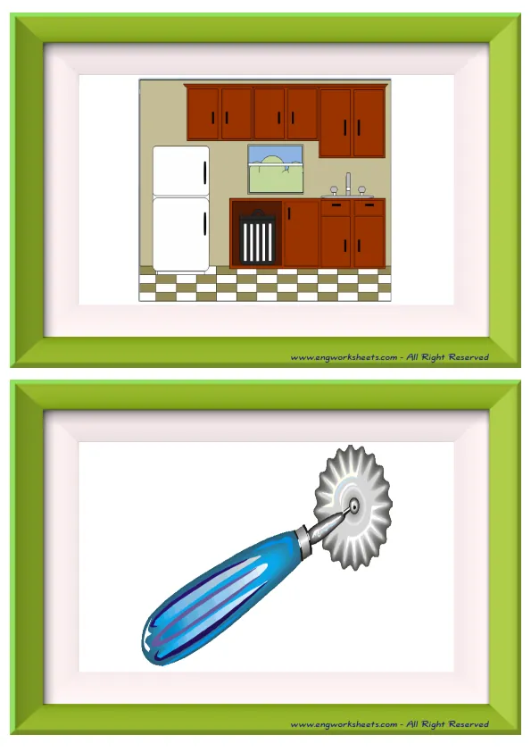 Mini size enjoyable ESL Flashcard Kitchen for kids and teachers.