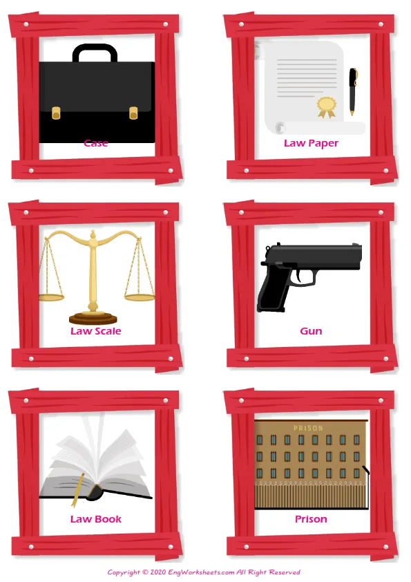 Law and Justice vocabulary worksheet with words, six images per page