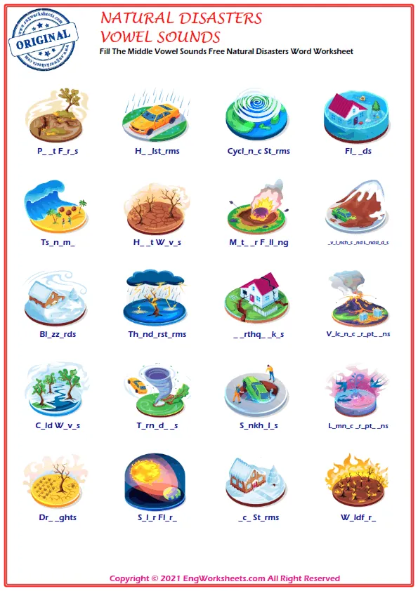 Fill The Middle Vowel Sounds Free Natural Disasters Word Worksheet