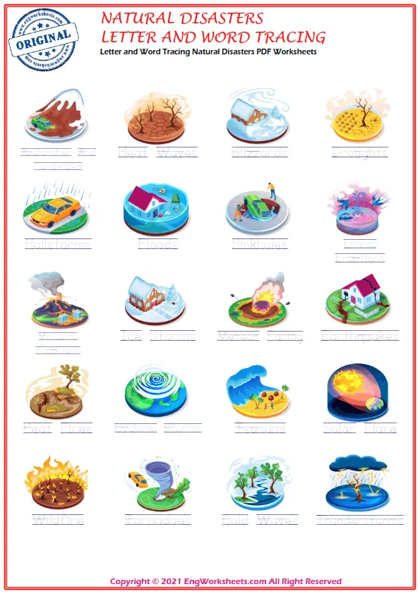 Letter and Word Tracing Natural Disasters PDF Worksheets