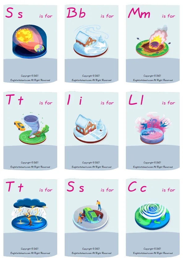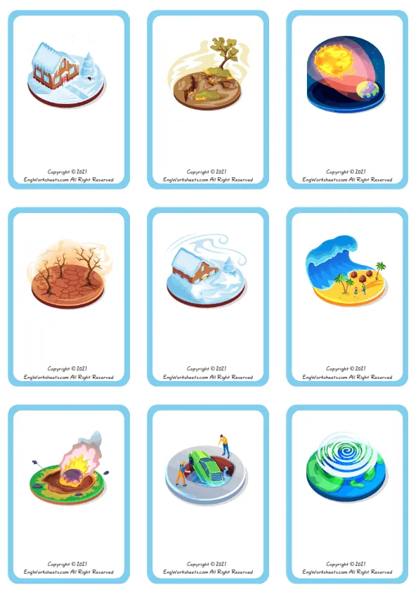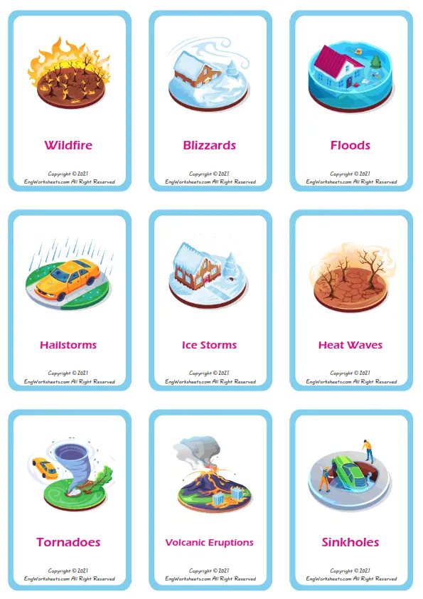 Flashcard pictures of the Natural Disasters given without words, with nine pictures on a page with a different design. You can print our worksheet prepared using Natural Disasters pictures in different sizes and use it for remembering in your classroom or at home. Using thick paper, you can use it with your friends to carry it in your pocket or purse at all times or to play games in the classroom. Thus, learning will become much more fun.