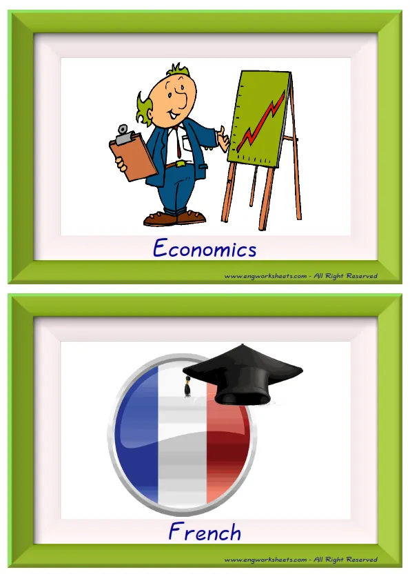 Half page ESL Flashcard without words containing School Subjects picture for kids and teachers.