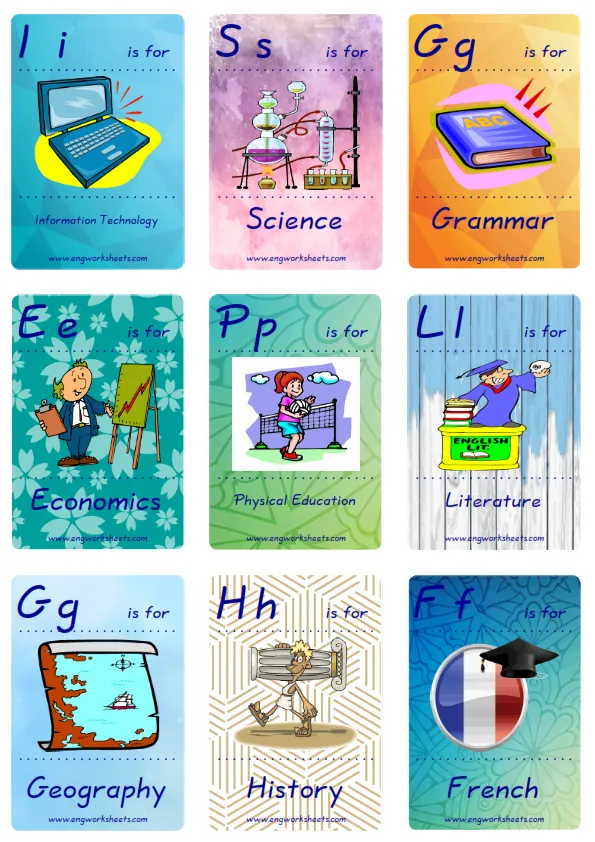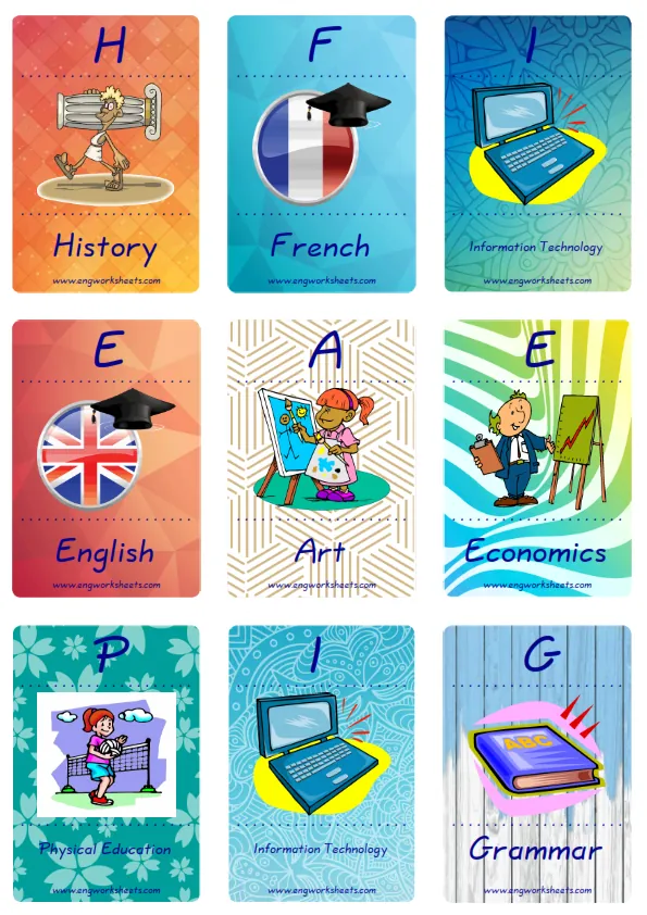 Mini size enjoyable ESL Flashcard School Subjects for kids and teachers.