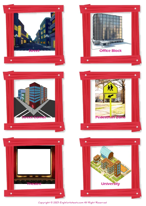 Flashcard of Town pictures supplied with words, with nine pictures on a page. You can print our worksheet prepared using Town pictures in different sizes and use it for remembering in your classroom or at home. Using thick paper, you can use it with your friends to carry it in your pocket or purse at all times or to play games in the classroom. Thus, learning will become much more fun.