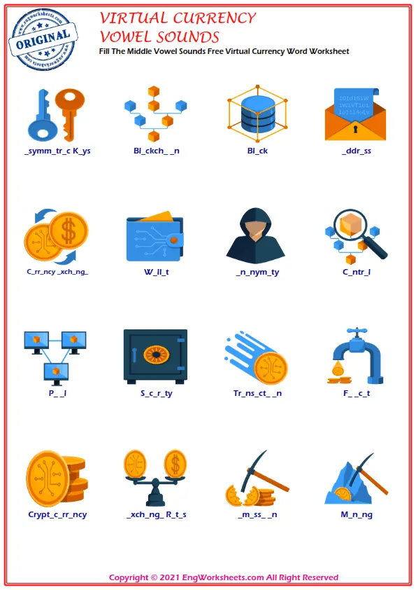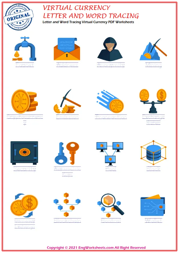 The words to be written under the pictures on our Virtual Currency printable English worksheet are given in bulk at the top of our worksheet for kids. Write the words under the correct pictures, you can check what you wrote in the answer keys. On our Virtual Currency vocabulary worksheet, you will understand how much you have learned the words and pictures you match in your memory.