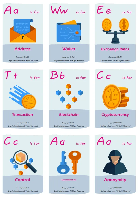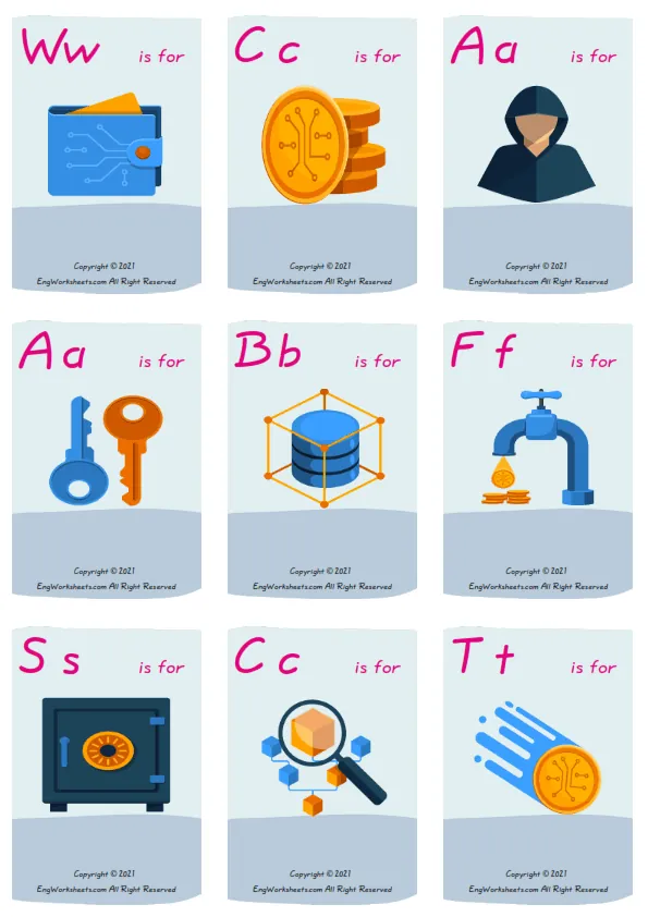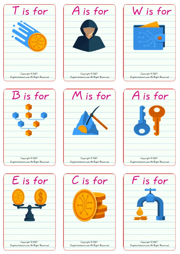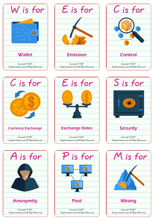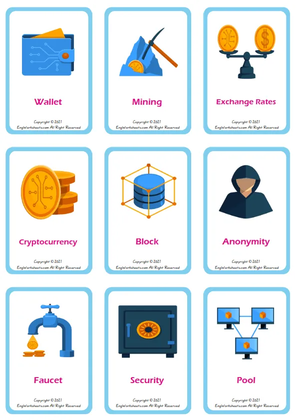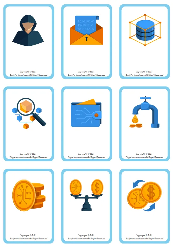 Virtual Currency vocabulary worksheet with words, nine images per page