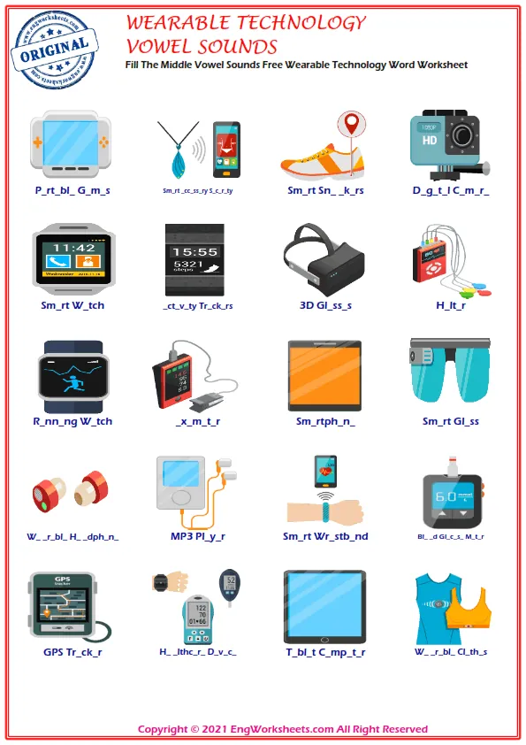 Fill The Middle Vowel Sounds Free Wearable Technology Word Worksheet