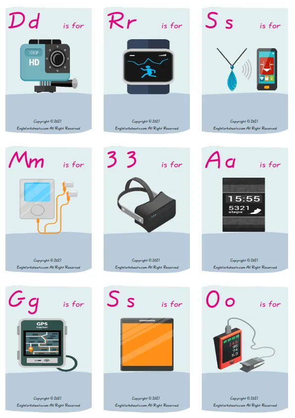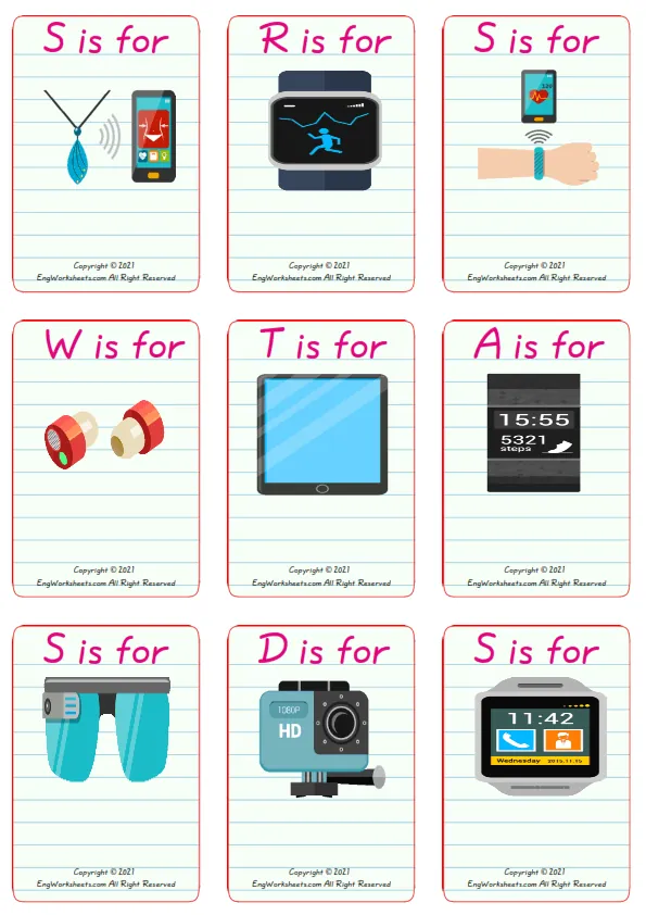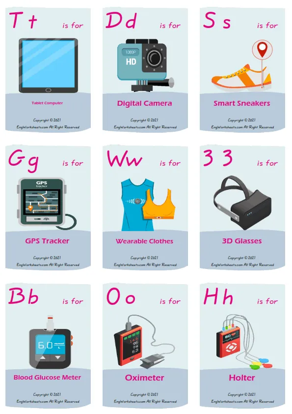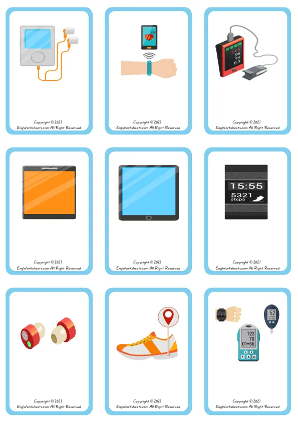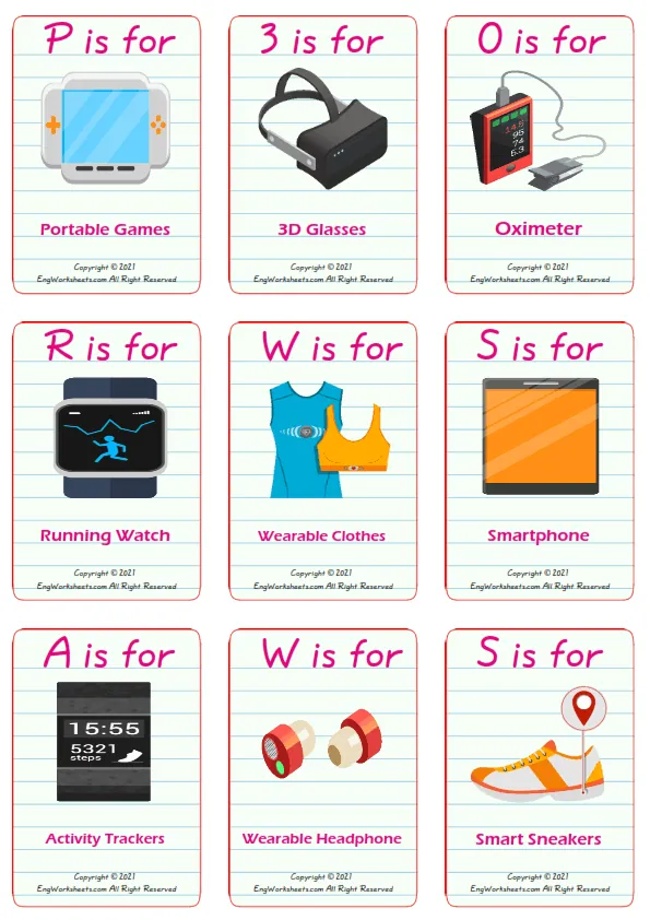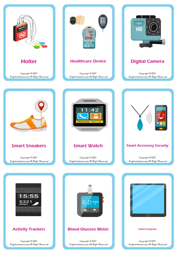 Wearable Technology vocabulary worksheet with words, nine images per page