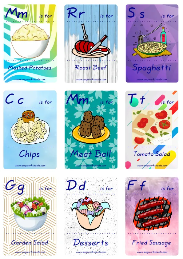 You can always keep the mini enjoyable Fast Food flashcards around you, and study in everywhere. You can play with your friends and your teacher reciprocatively. Nine picture were jointly provided on one page.