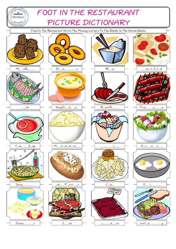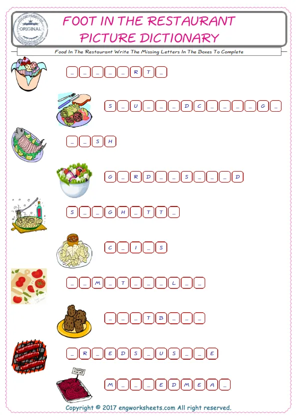 Food In The Restaurant vocabulary for kids and teachers Our English worksheets are a bundle of fun to improve and practice. Check the ESL printable worksheets and also the picture of Food In The Restaurant find their names and fill the missing letters in the boxes. It is an attentive, improving and fine activity. Our unique and several worksheets wait for you; don't waste your time. Don’t stop, look alive!