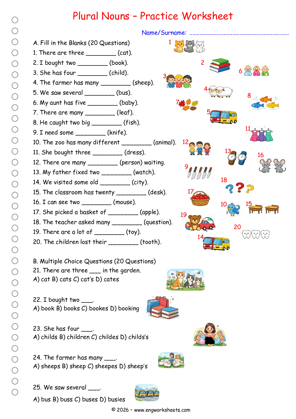 This Plural Nouns worksheet helps students practice regular and irregular plural forms through 20 fill in the blanks and 20 multiple choice questions. Designed for ESL and EFL learners, the worksheet uses clear examples such as children, mice, teeth, and buses to strengthen grammar accuracy. The notebook (spiral) style layout, printable PDF format, and student-friendly design make it ideal for classroom use, homework, and exams. Perfect for elementary and middle school English learners.