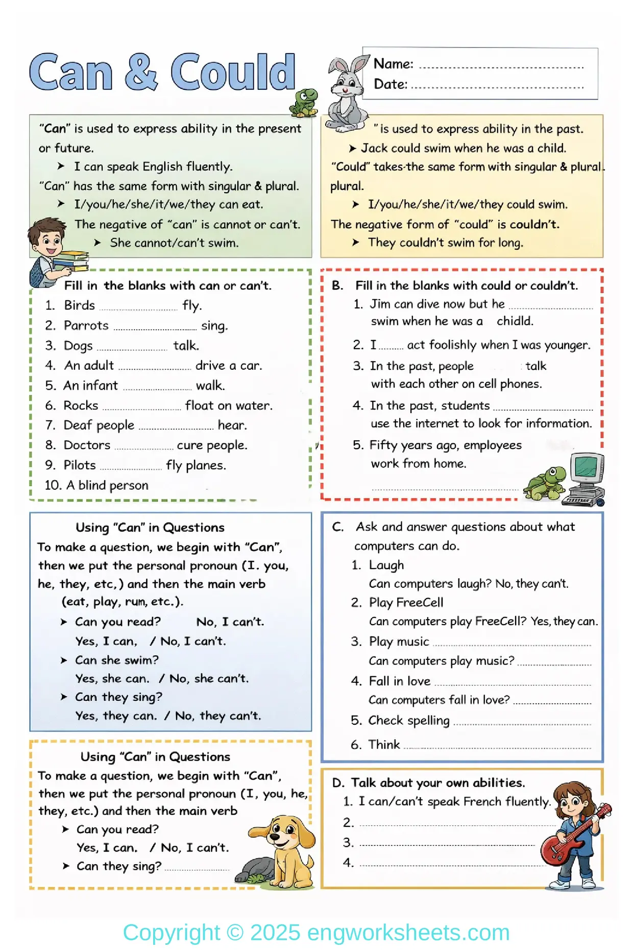 This Can & Could worksheet is a printable ESL grammar worksheet designed for elementary and lower-intermediate learners. It helps students understand can and could for ability in the present and past through clear explanations, engaging exercises, and visual support. The worksheet includes fill-in-the-blank activities, question–answer practice, and a complete answer key. Prepared in A4 format with a white background, it is ideal for classroom use and home practice. This resource is perfect for teachers looking for a high-quality English grammar worksheet, can vs could exercises, and ESL printable PDF materials.
