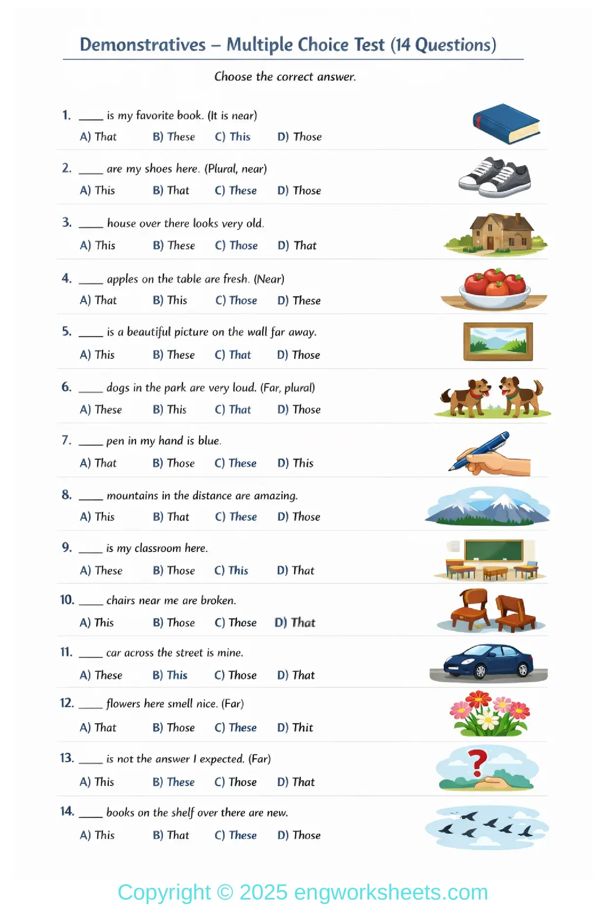 This Demonstratives Multiple Choice Test is designed to help students practice this, that, these, and those in a clear and visual way. The worksheet includes 14 multiple-choice questions supported by simple vector images, making it ideal for ESL, EFL, and primary learners. With an A4 white background and a separate red-colored answer key, it is perfect for classroom use and printing. This resource helps students understand near and far, singular and plural demonstratives effectively. Keywords: demonstratives worksheet, this that these those, ESL grammar test, English worksheets, printable grammar test