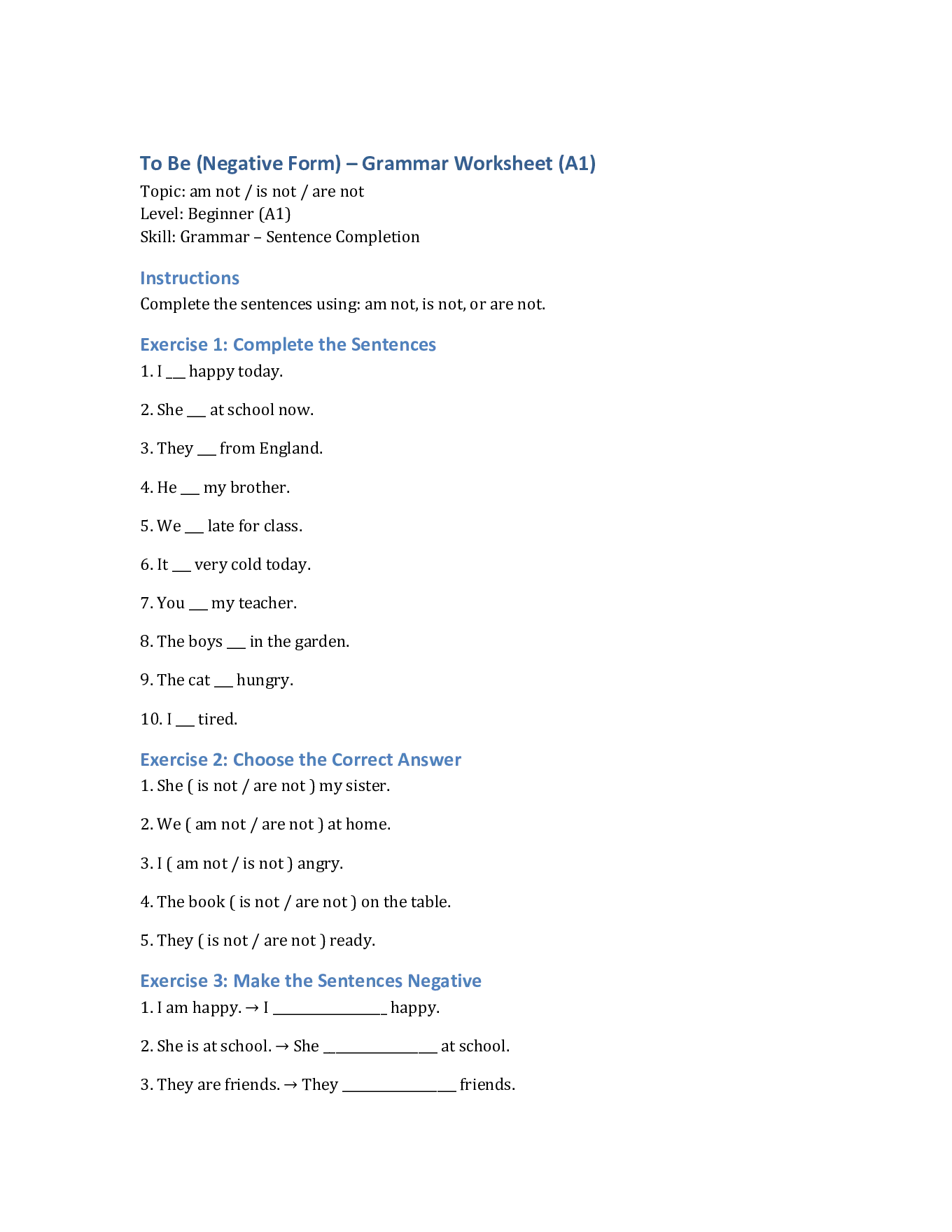 This beginner-level ESL worksheet helps students practice the negative form of the verb to be using am not, is not, and are not. Learners complete sentence-based activities to improve grammar accuracy and confidence. The worksheet is suitable for elementary students, classroom use, homework, and individual practice.