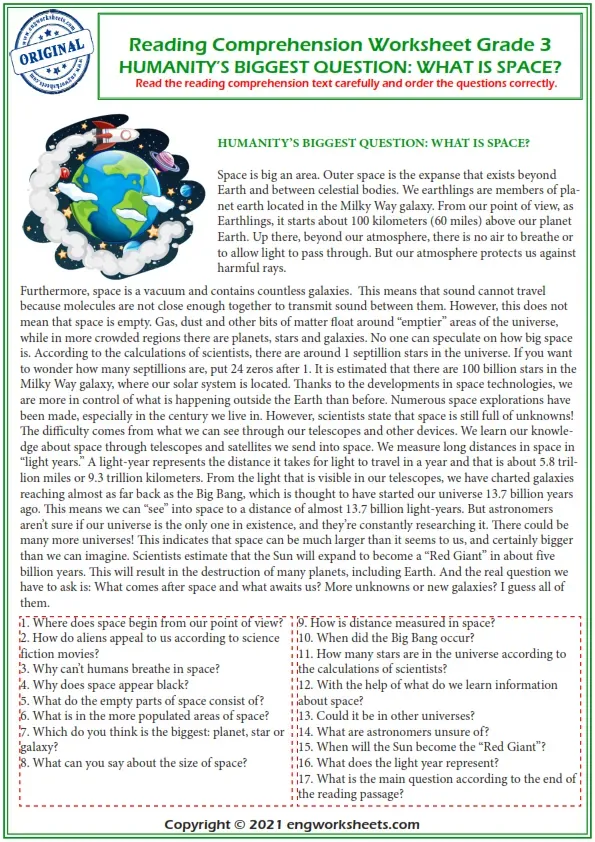 This Grade 3 Reading Comprehension Worksheet Gives Beginners Some Reading Practice. They First Have To Read The Passage, Then Complete The Activities That Follow. This Downloadable And Free Printable Pdf Worksheet. It Can Be Used To Improve Your Class's Reading Comprehension And Literacy Skills About Space. This Worksheet Has The Theme Of Daily Routines. Reading Comprehension, Reading Comprehension Worksheets Grade 3, Reading Comprehension Worksheet Grade 3, Vocabulary, Reading Comprehension Vocabulary, Reading Comprehension For Kids, Reading Comprehension Exercises, Reading Comprehension For Grade 3, Reading Comprehension Test, Free Reading Comprehension Worksheets, Reading Comprehension Worksheets Pdf With Answers. Reading Comprehension Doctor Text Worksheets, Reading Comprehension Middle School, Reading Comprehension Elementary, English Esl Reading Comprehension Worksheet Grade 3
