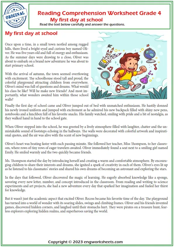 Dive Into Reading With “The Story Of The Love Fish†Welcome To A New Adventure In Reading Comprehension With Engworksheets.com! Today We Dive Into The Depths Of The Ocean With A Fascinating Tale Called "the Story Of The Love Fish". Perfect For 4Th Graders, This Story Explores Themes Of Friendship, Understanding, And The Power Of Love. The Story Of The Love Fish Introduces Us To Love, A Cheerful And Curious Fish Who Enjoys Exploring Every Corner Of The Ocean. Love's Life Becomes Exciting When She Meets Greenay, A Frog With A Cheerful Personality And Graceful Movements. Despite Their Differences, Love And Greenay Embark On A Journey Of Understanding And Mutual Respect That Proves That Love Can Overcome Any Obstacle. At Engworksheets.com, We Believe In The Power Of Stories To Spark The Imagination And Foster A Love Of Reading. “The Story Of The Love Fish†Is Just One Of The Many Resources We Offer To Help Students Improve Their Reading Skills. So Dive In And Discover The Wonders Of The Deep Blue Ocean With Love And Greenay! Remember, Reading Comprehension Isn't Just About Understanding The Words On The Page, It's About Connecting With The Characters And Being Immersed In Their World. Good Reading! Reading Comprehension Worksheet Grade 4, Vocabulary, Reading Comprehension Vocabulary, Reading Comprehension For Kids, Reading Comprehension Exercises, Reading Comprehension For Grade 4, Reading Comprehension Test, Free Reading Comprehension Worksheets, Reading Comprehension Worksheets Pdf With Answers. Reading Comprehension Doctor Text Worksheets, Reading Comprehension Middle School, Reading Comprehension Elementary, English Esl Reading Comprehension Worksheets Grade 4