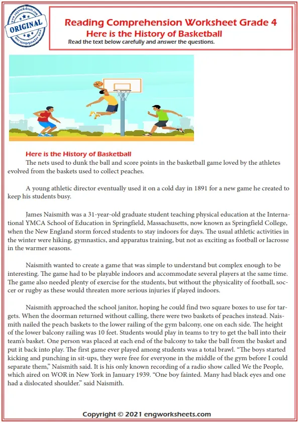 This Grade 4 Reading Comprehension Worksheet Gives Beginners Some Reading Practice. They First Have To Read The Passage, Then Complete The Activities That Follow. This Downloadable And Free Printable Pdf Worksheet. It Can Be Used To Improve Your Class's Reading Comprehension And Literacy Skills In Learning About Basketball History. This Worksheet Has The Theme Of Daily Routines And Basketball History. Basketball History Reading Comprehension, Basketball History Reading Comprehension Worksheets Grade 4, Reading Comprehension Worksheet Grade 4, Vocabulary, Reading Comprehension Vocabulary, Reading Comprehension For Kids, Reading Comprehension Exercises, Reading Comprehension For Grade 4, Reading Comprehension Test, Free Reading Comprehension Worksheets, Reading Comprehension Worksheets Pdf With Answers. Reading Comprehension Doctor Text Worksheets, Reading Comprehension Middle School, Reading Comprehension Elementary, English Esl Reading Comprehension Worksheets Grade 4