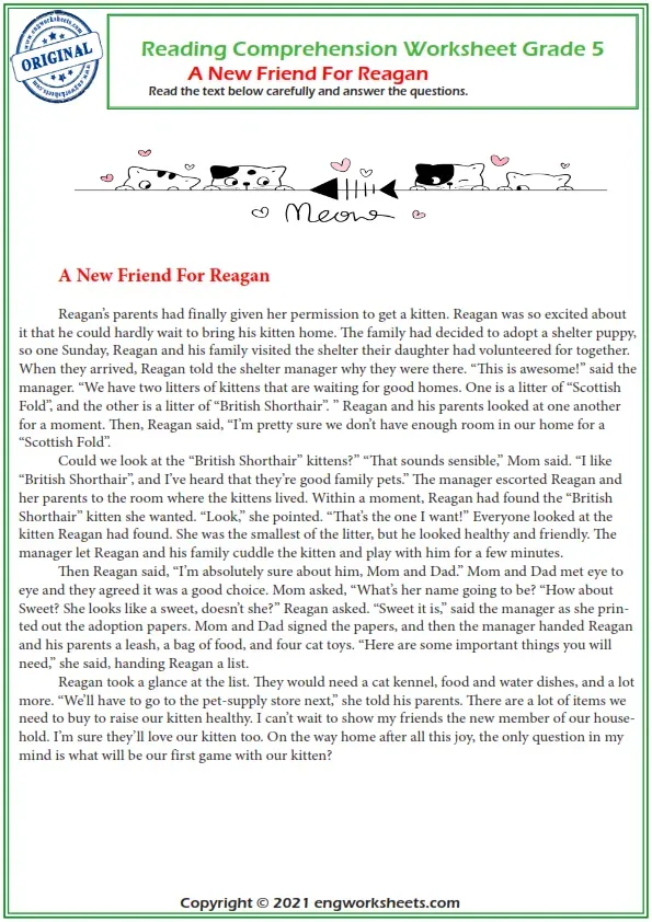 5Th Grade A New Friend For Reagan Reading Comprehension Worksheet. This Grade 5 Reading Comprehension Worksheet Gives Beginners Some Reading Practice. They First Have To Read The Passage, Then Complete The Activities That Follow. This Downloadable And Free Printable Pdf Worksheet. It Can Be Used To Improve Your Class's Reading Comprehension And Literacy Skills About Being Open To New Ideas. A New Friend For Reagan Comprehension, A New Friend For Reagan Reading Comprehension Worksheets Grade 5, Reading Comprehension Worksheet Grade 5, Vocabulary, Reading Comprehension Vocabulary, Reading Comprehension For Kids, Reading Comprehension Exercises, Reading Comprehension For Grade 5, Reading Comprehension Test, Free Reading Comprehension Worksheets, Reading Comprehension Worksheets Pdf With Answers. Reading Comprehension Doctor Text Worksheets, Reading Comprehension Middle School, Reading Comprehension Elementary, English Esl Reading Comprehension Worksheets Grade 5