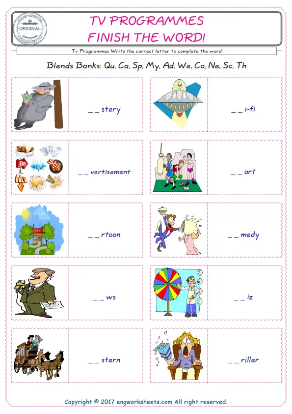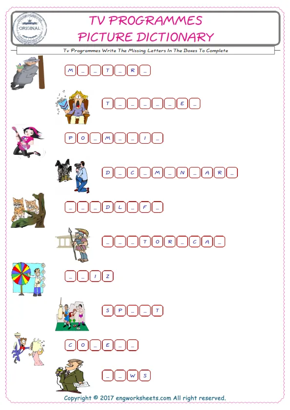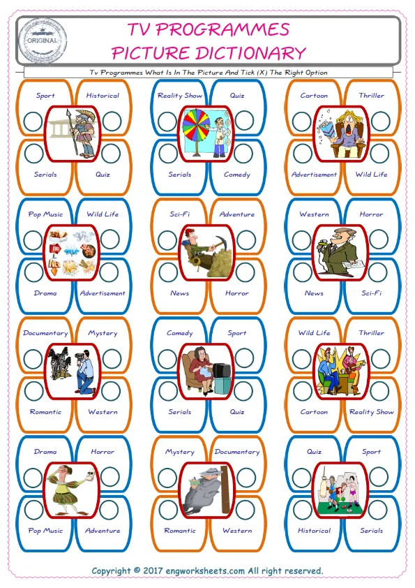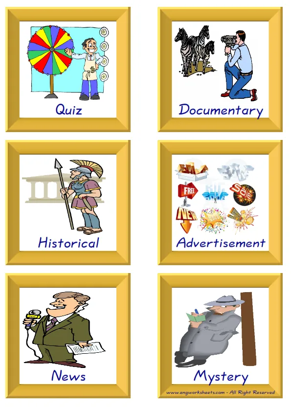 Tv Programmes English worksheets for kids and teachers special to learning Tv Programmes words. Tv Programmes ESL picture dictionary worksheets to improve vocabulary. Tv Programmes poster works to hang in your classroom. Check the picture and review the words and learn swiftly. By matching the words and pictures, you can make learning both fun and permanent. Our worksheets are very easy, convenient and fun in order to teach and learn the Tv Programmes words. Each of English worksheets you created is different to each other.