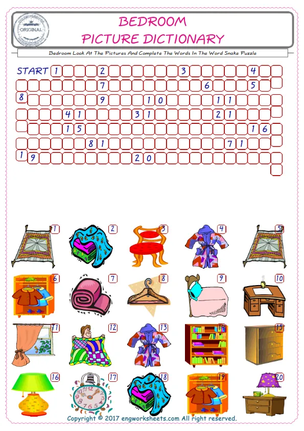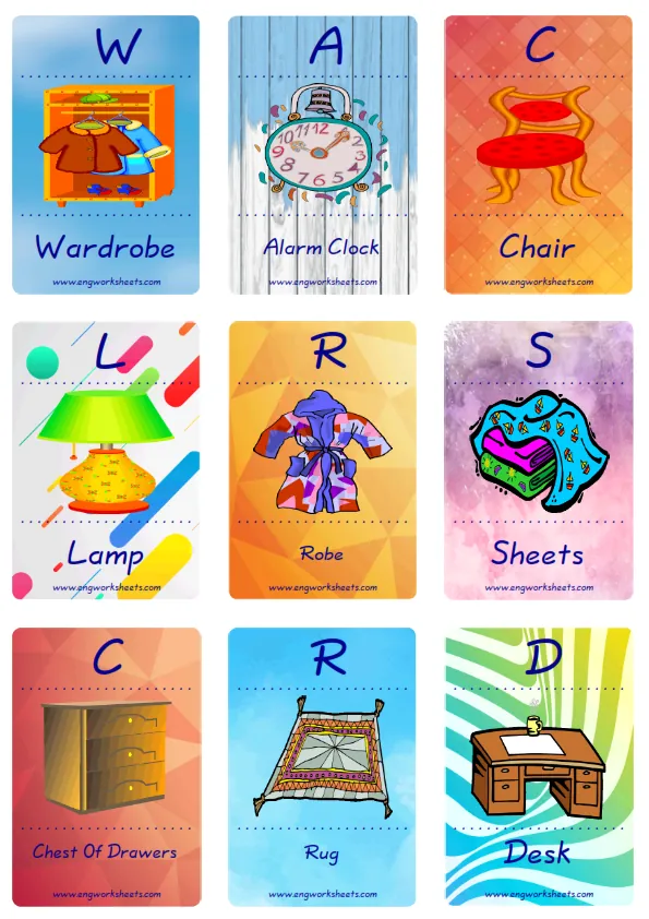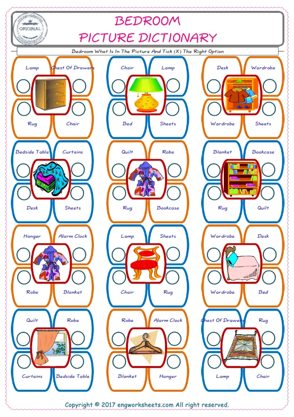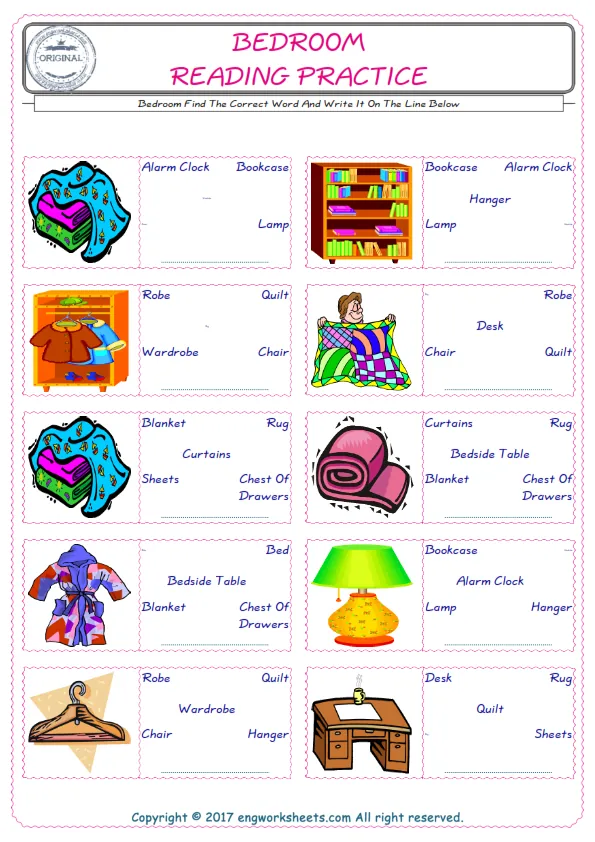Bedroom English worksheets for kids and teachers special to learning Bedroom words. Bedroom ESL picture dictionary worksheets to improve vocabulary. Bedroom poster works to hang in your classroom. Check the picture and review the words and learn swiftly. By matching the words and pictures, you can make learning both fun and permanent. Our worksheets are very easy, convenient and fun in order to teach and learn the Bedroom words. Each of English worksheets you created is different to each other.