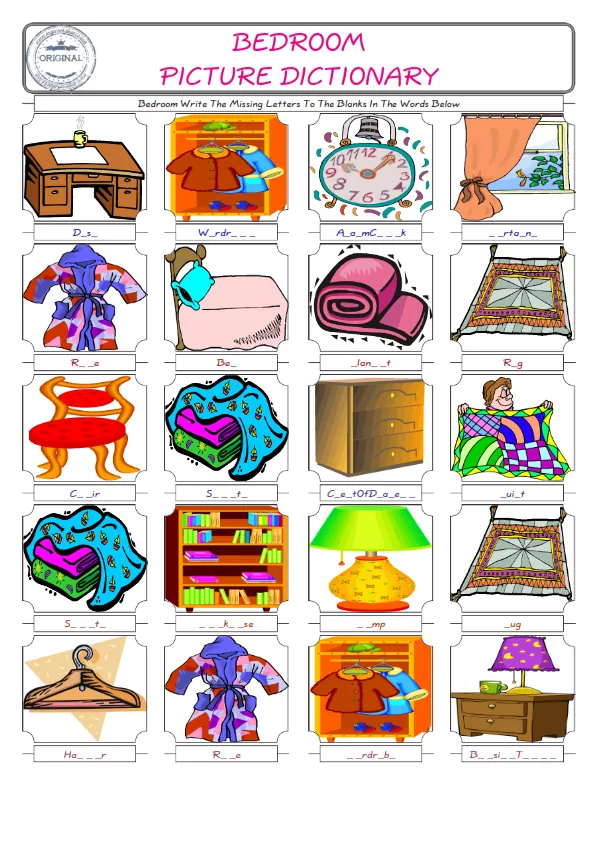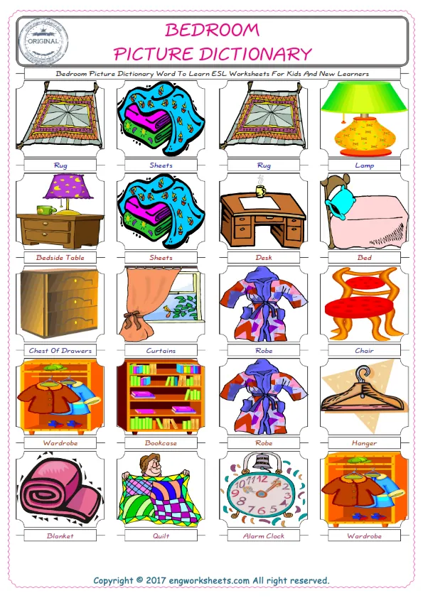 Bedroom English Worksheet for Kids ESL Printable Picture Dictionary