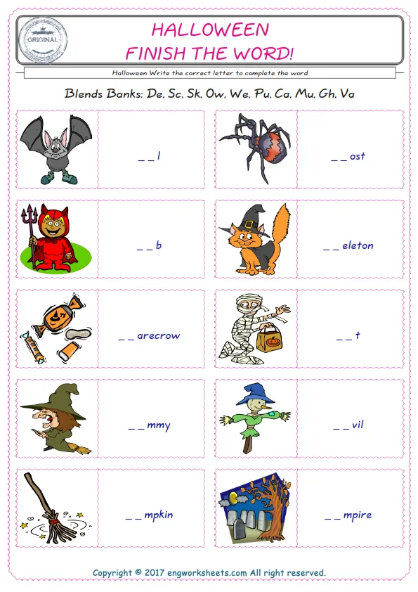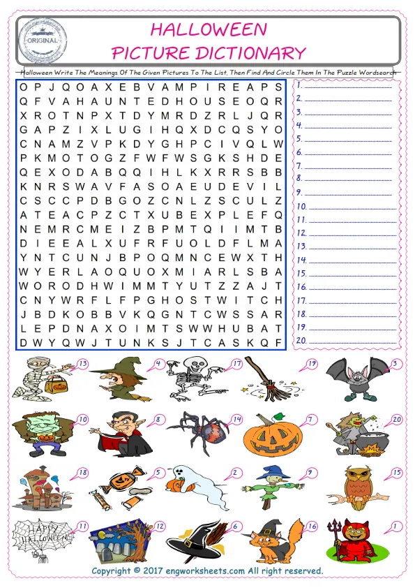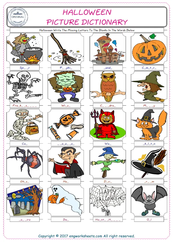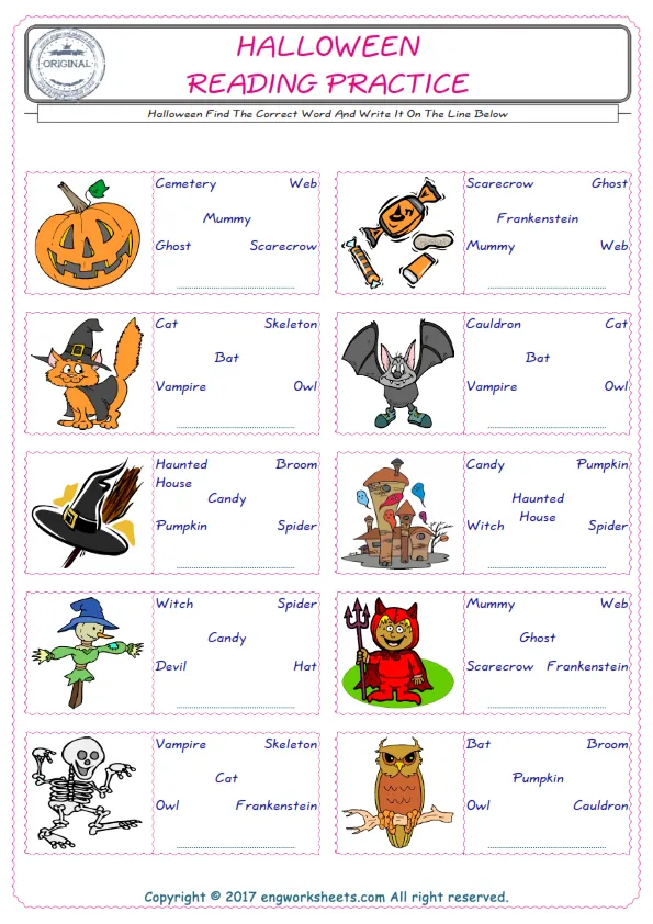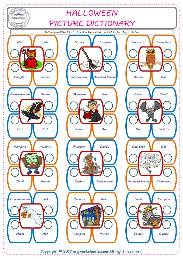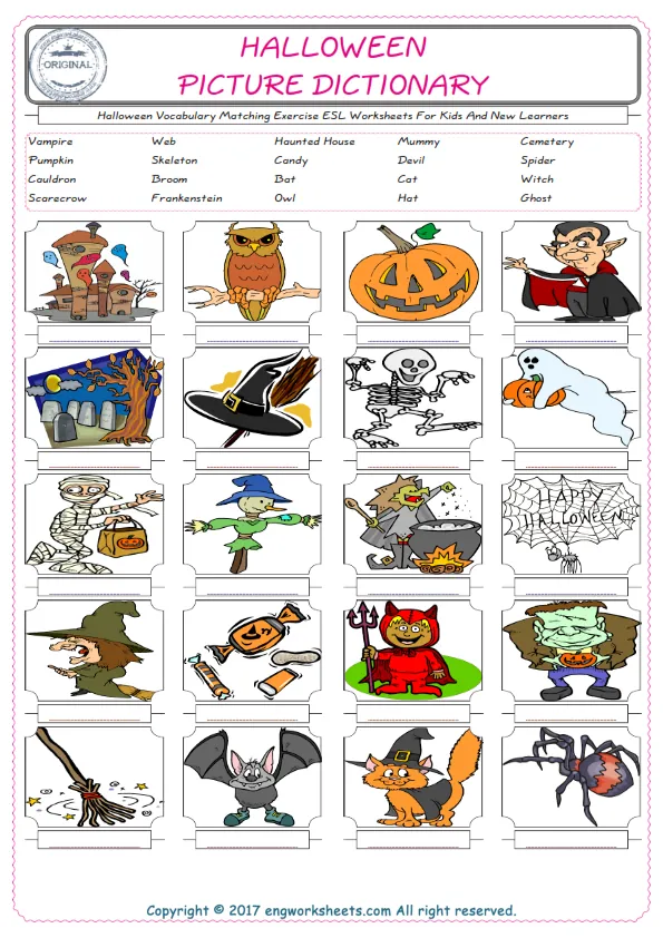 Halloween English worksheets for kids and teachers special to learning Halloween words. Halloween ESL picture dictionary worksheets to improve vocabulary. Halloween poster works to hang in your classroom. Check the picture and review the words and learn swiftly. By matching the words and pictures, you can make learning both fun and permanent. Our worksheets are very easy, convenient and fun in order to teach and learn the Halloween words. Each of English worksheets you created is different to each other.