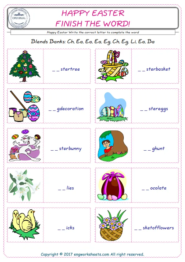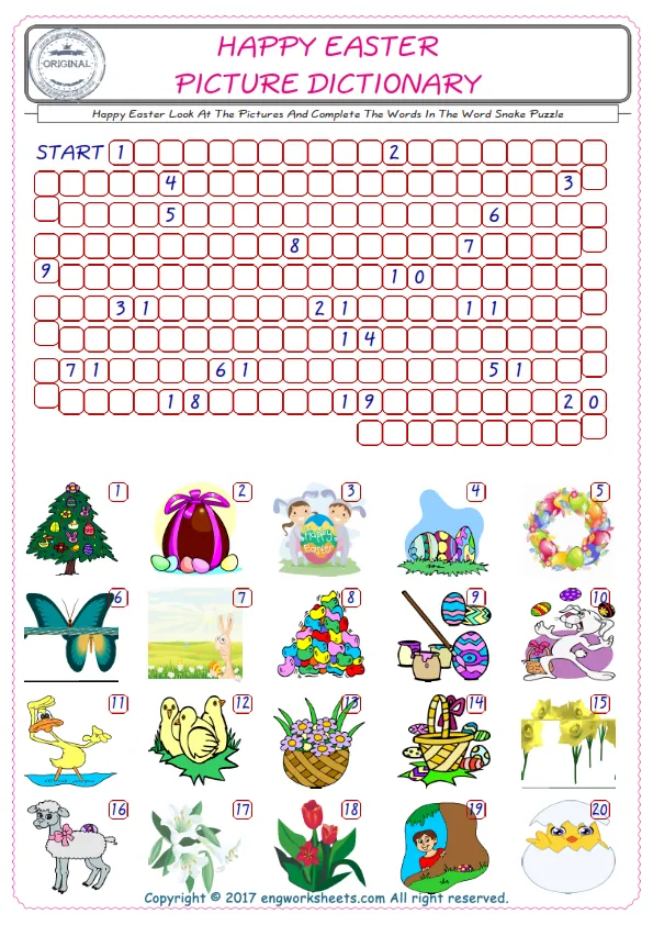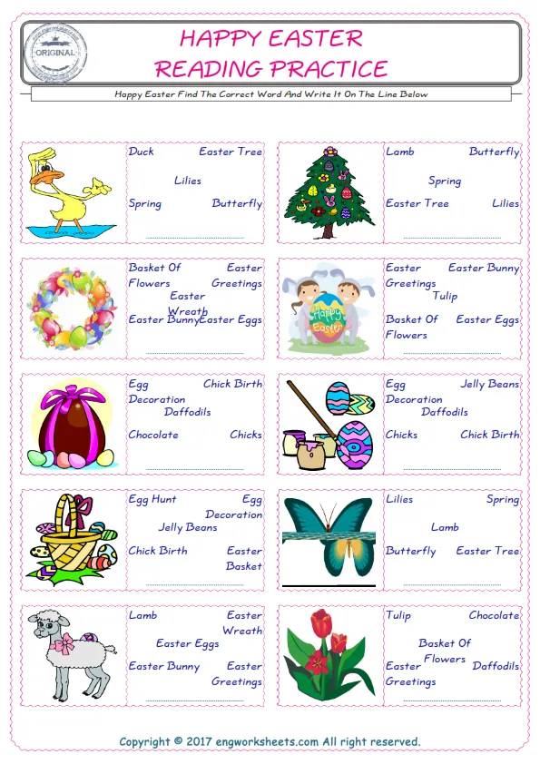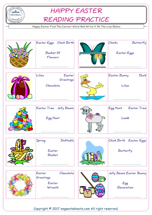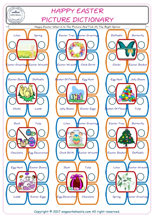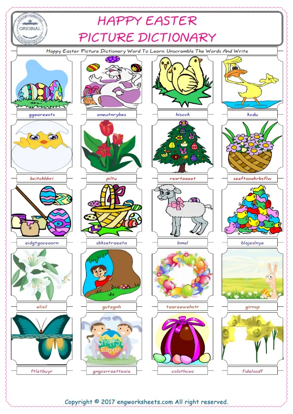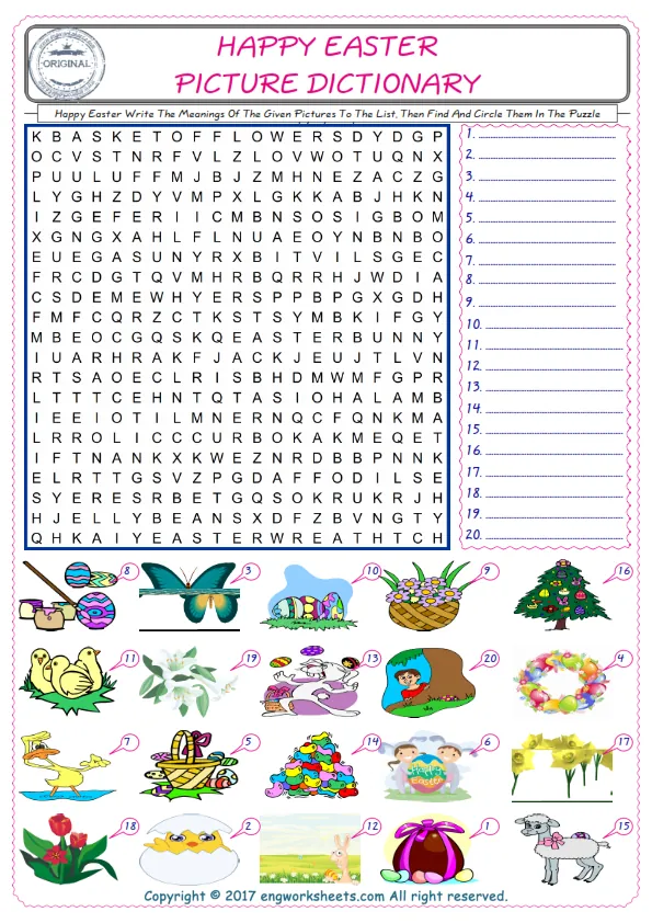 Happy Easter English worksheets for kids and teachers special to learning Happy Easter words. Happy Easter ESL picture dictionary worksheets to improve vocabulary. Happy Easter poster works to hang in your classroom. Check the picture and review the words and learn swiftly. By matching the words and pictures, you can make learning both fun and permanent. Our worksheets are very easy, convenient and fun in order to teach and learn the Happy Easter words. Each of English worksheets you created is different to each other.