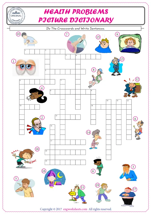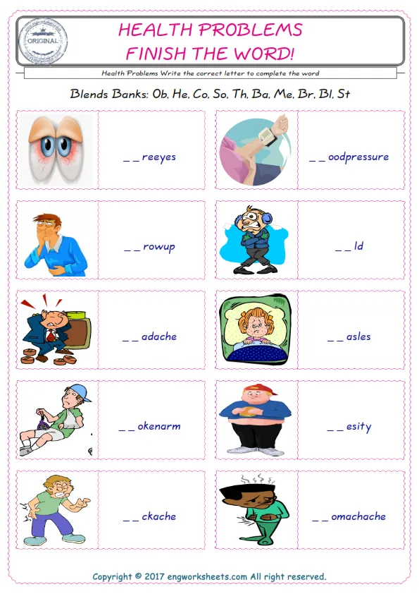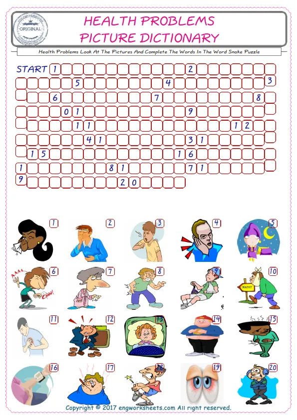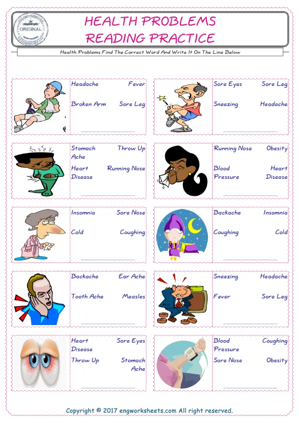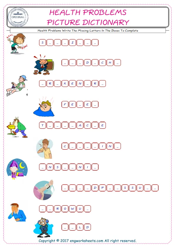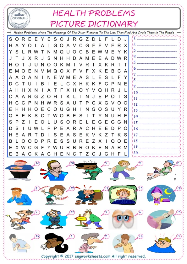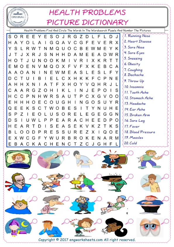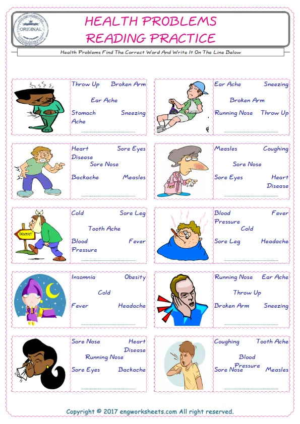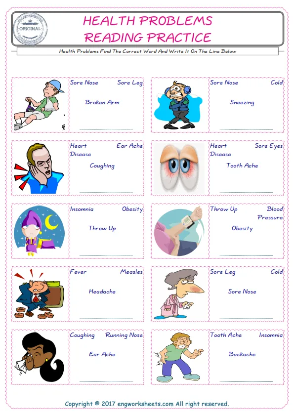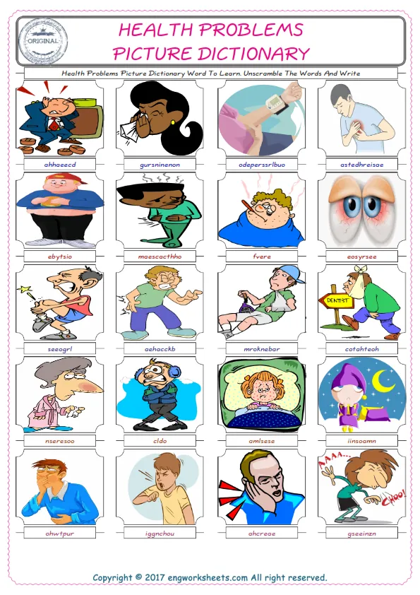 Health Problems English worksheets for kids and teachers special to learning Health Problems words. Health Problems ESL picture dictionary worksheets to improve vocabulary. Health Problems poster works to hang in your classroom. Check the picture and review the words and learn swiftly. By matching the words and pictures, you can make learning both fun and permanent. Our worksheets are very easy, convenient and fun in order to teach and learn the Health Problems words. Each of English worksheets you created is different to each other.