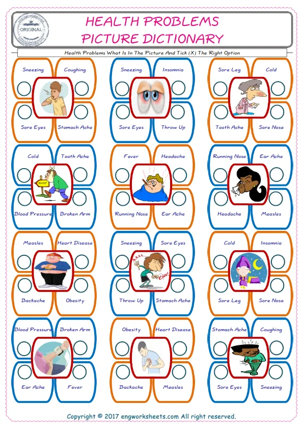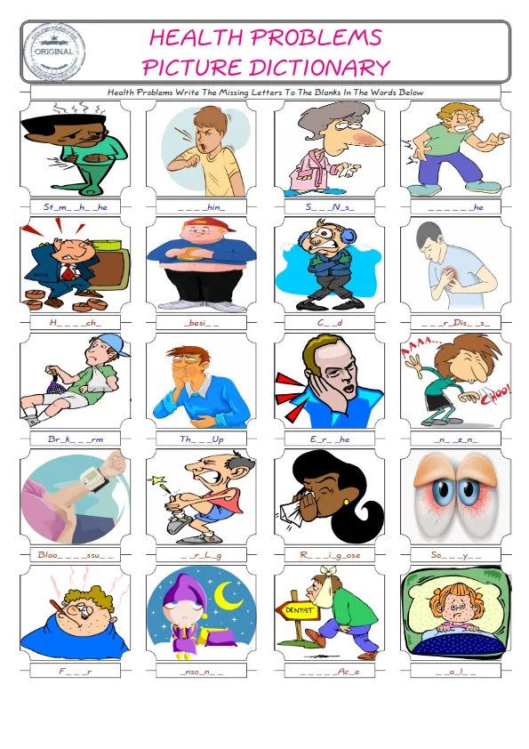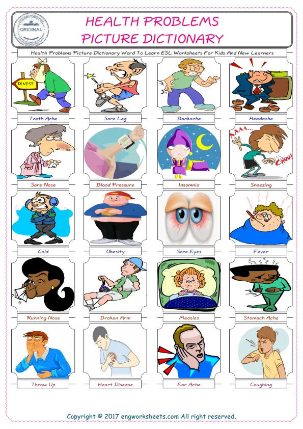 Health Problems English Worksheet for Kids ESL Printable Picture Dictionary