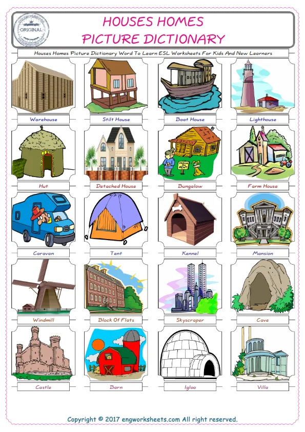 Houses Homes English Worksheet for Kids ESL Printable Picture Dictionary