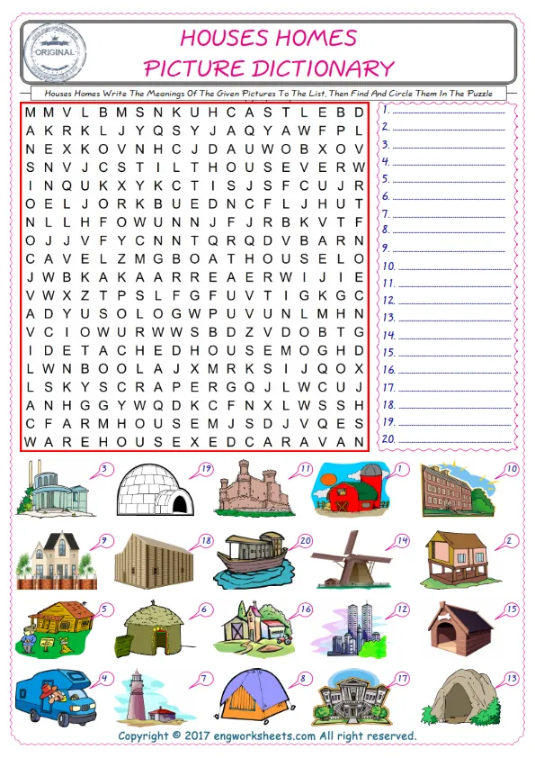 Houses Homes English worksheets for kids and teachers special to learning Houses Homes words. Houses Homes ESL picture dictionary worksheets to improve vocabulary. Houses Homes poster works to hang in your classroom. Check the picture and review the words and learn swiftly. By matching the words and pictures, you can make learning both fun and permanent. Our worksheets are very easy, convenient and fun in order to teach and learn the Houses Homes words. Each of English worksheets you created is different to each other.
