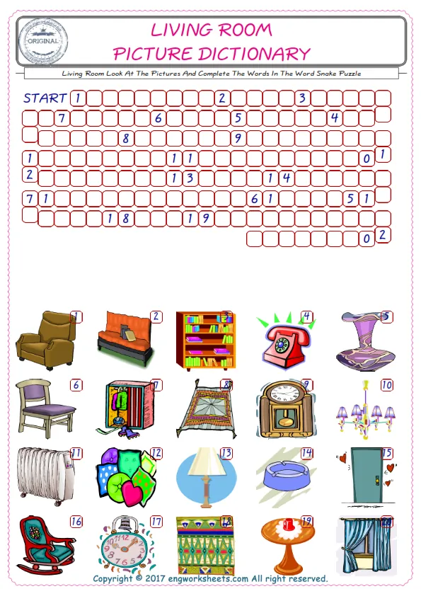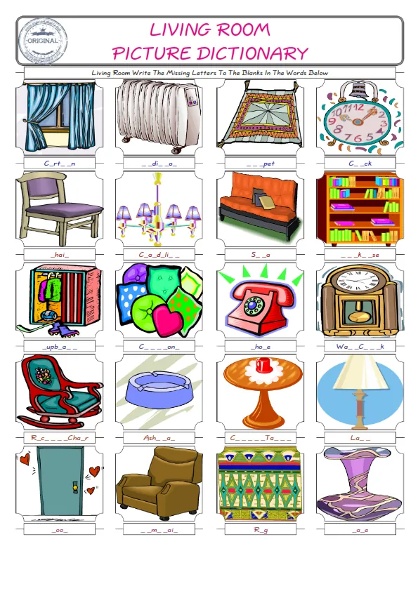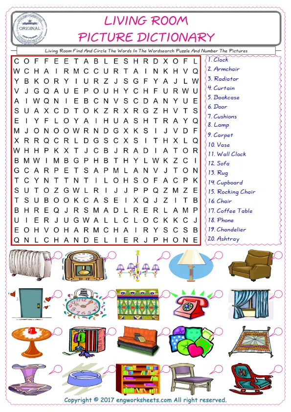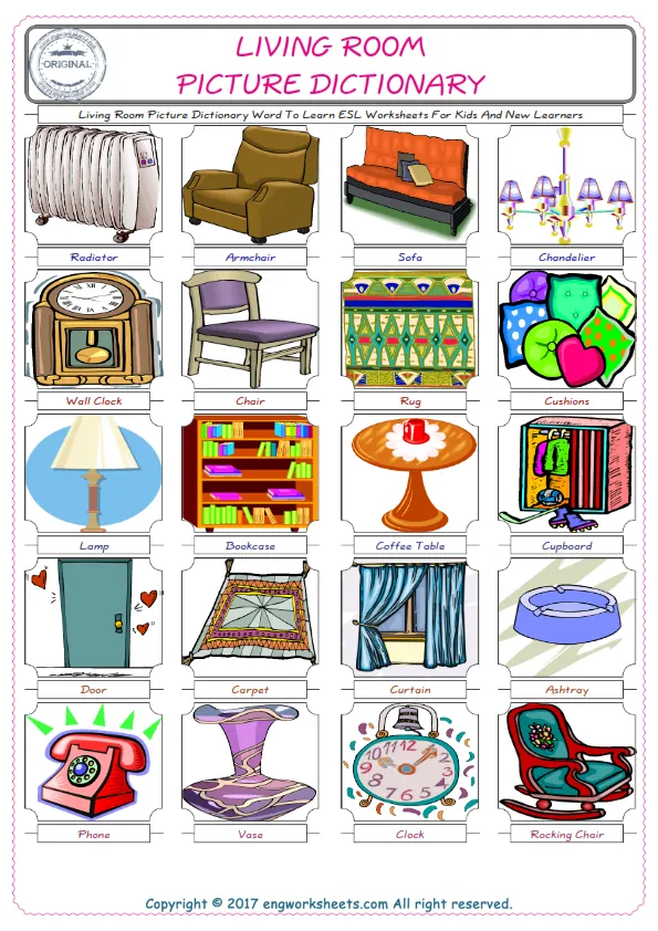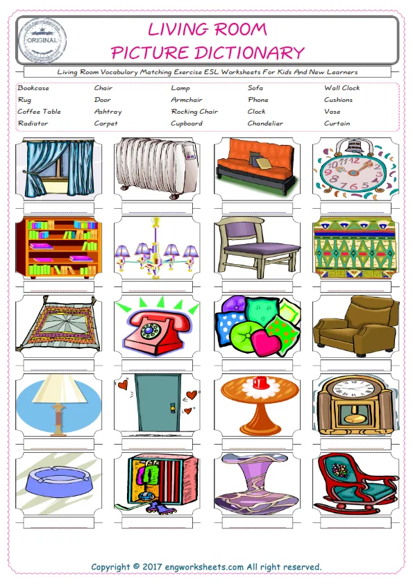 Living Room English Worksheet for Kids ESL Printable Picture Dictionary