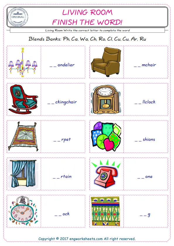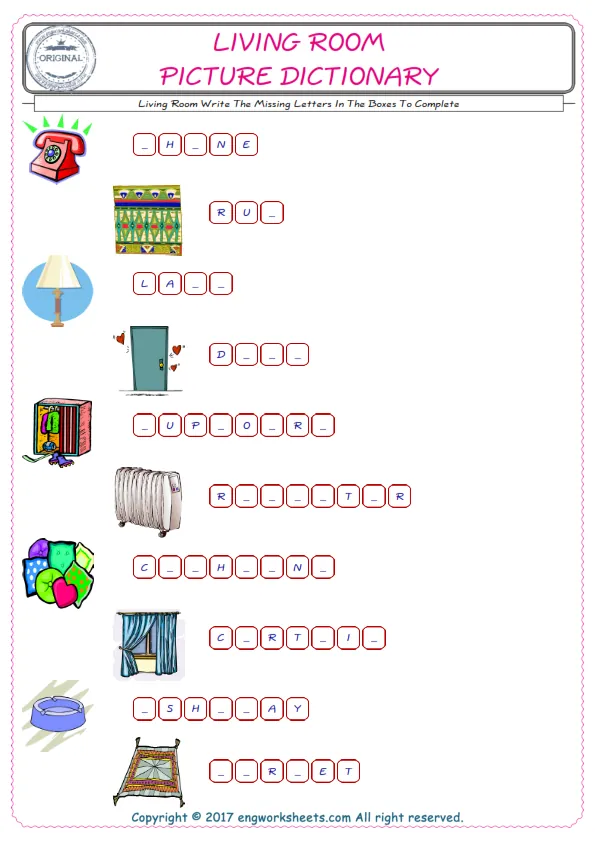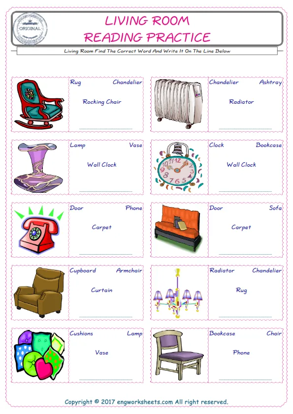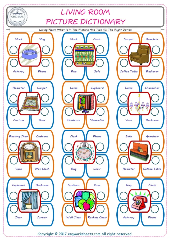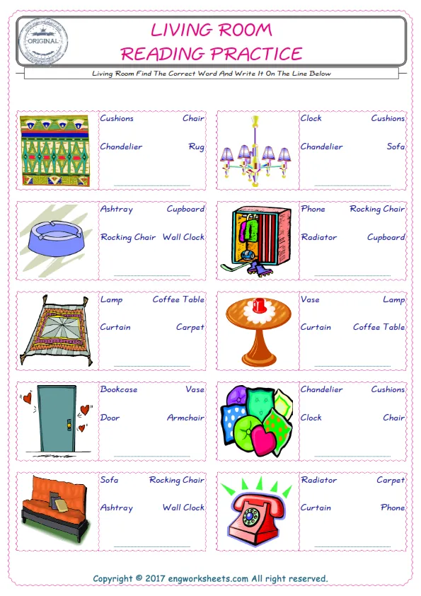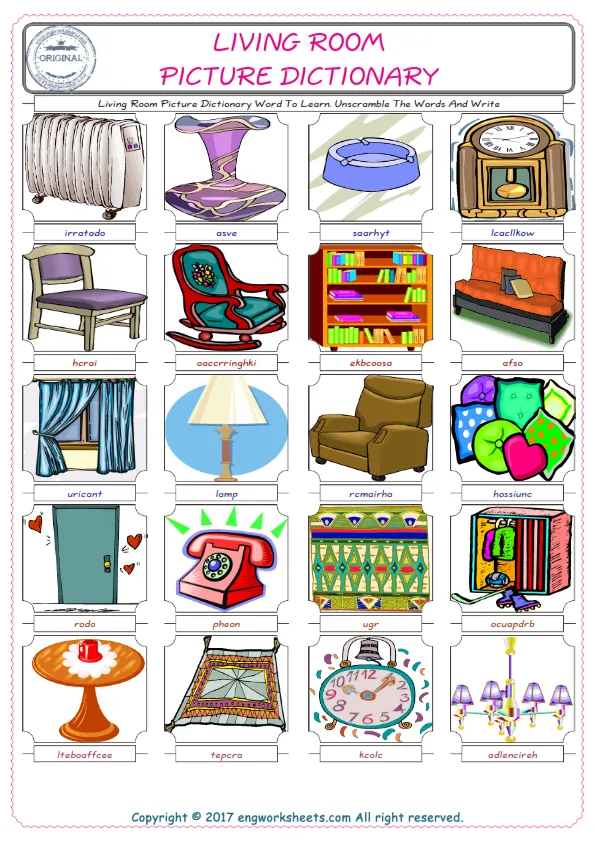 Living Room English worksheets for kids and teachers special to learning Living Room words. Living Room ESL picture dictionary worksheets to improve vocabulary. Living Room poster works to hang in your classroom. Check the picture and review the words and learn swiftly. By matching the words and pictures, you can make learning both fun and permanent. Our worksheets are very easy, convenient and fun in order to teach and learn the Living Room words. Each of English worksheets you created is different to each other.