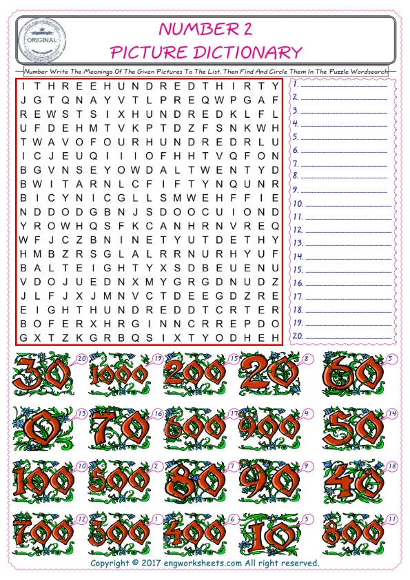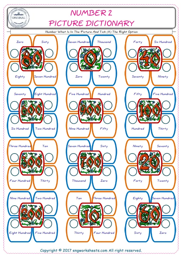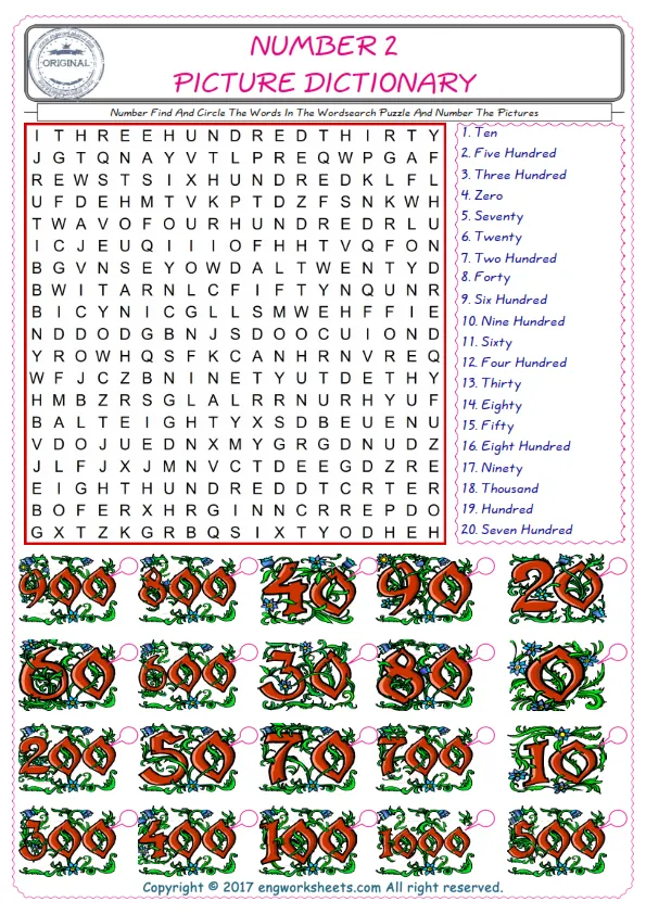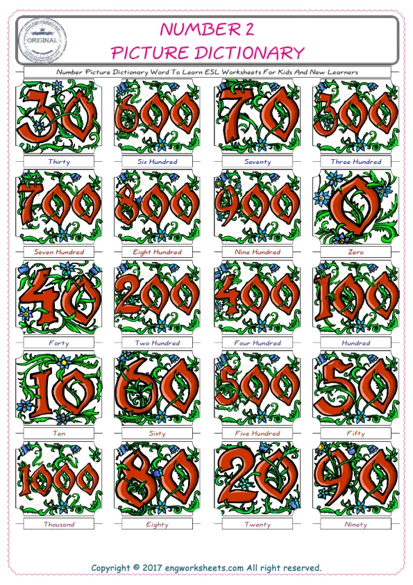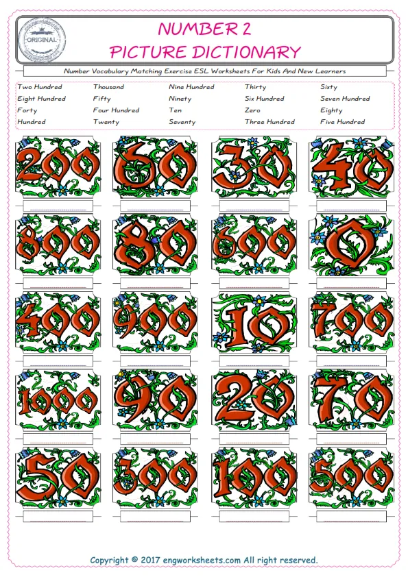 Number English worksheets for kids and teachers special to learning Number words. Number ESL picture dictionary worksheets to improve vocabulary. Number poster works to hang in your classroom. Check the picture and review the words and learn swiftly. By matching the words and pictures, you can make learning both fun and permanent. Our worksheets are very easy, convenient and fun in order to teach and learn the Number words. Each of English worksheets you created is different to each other.