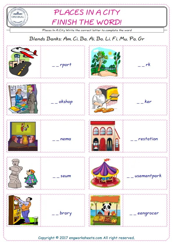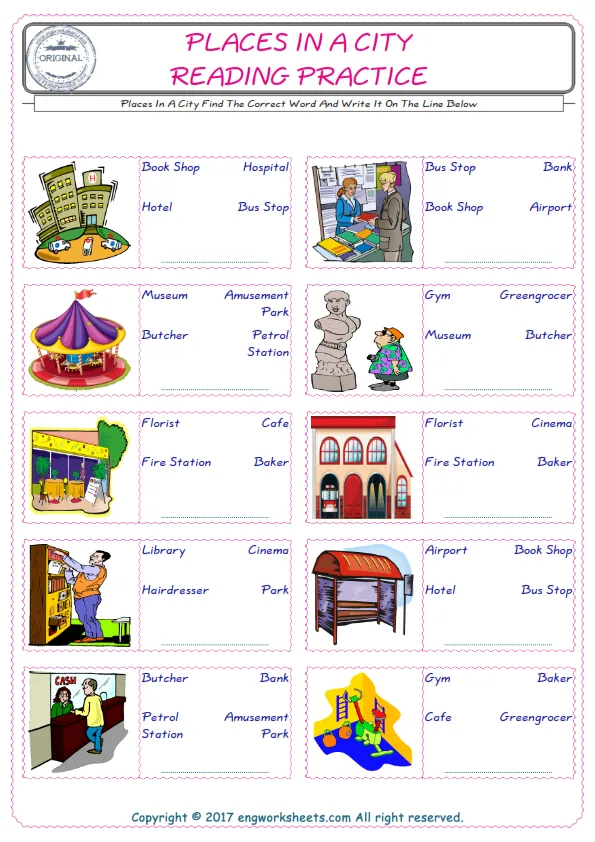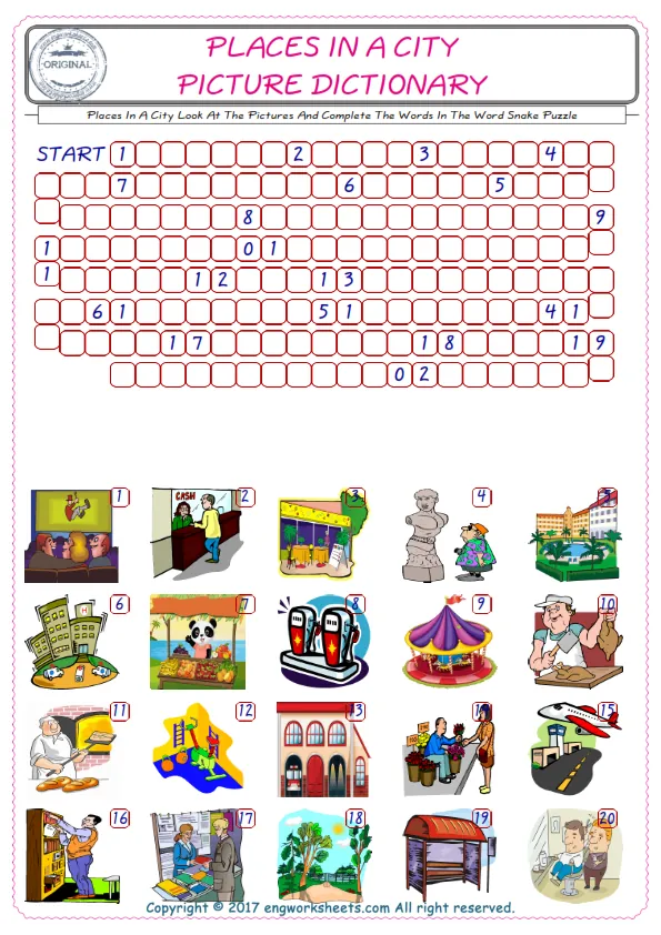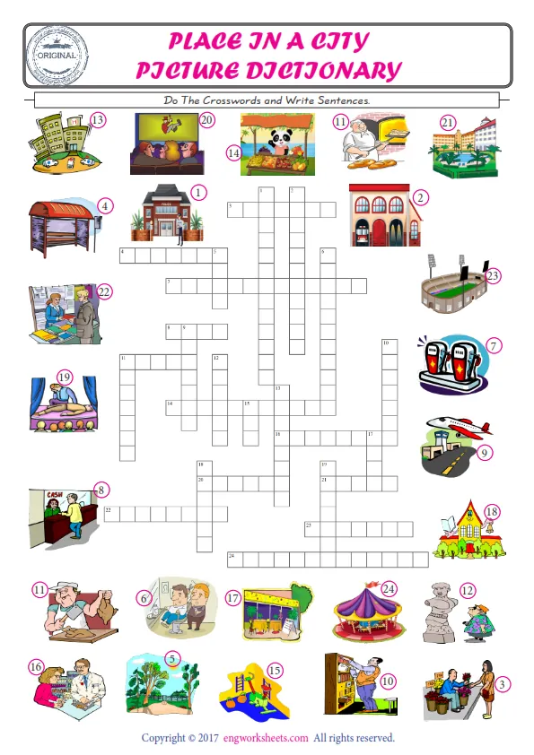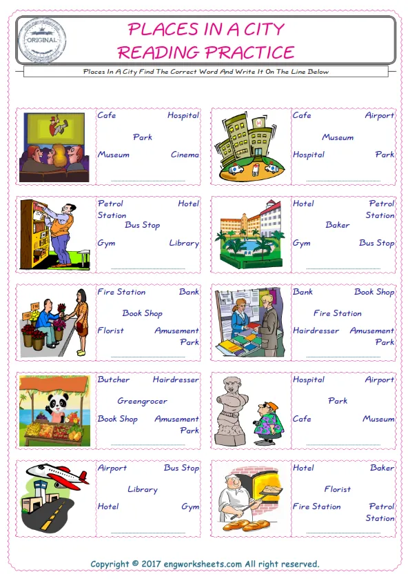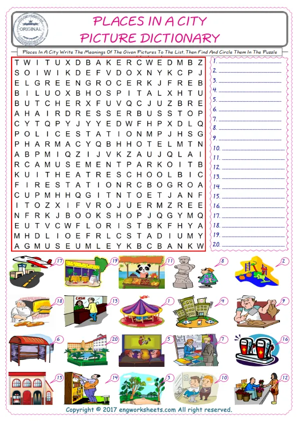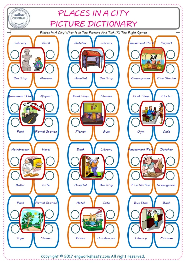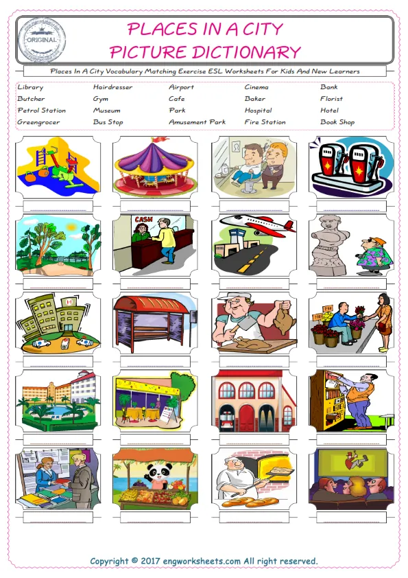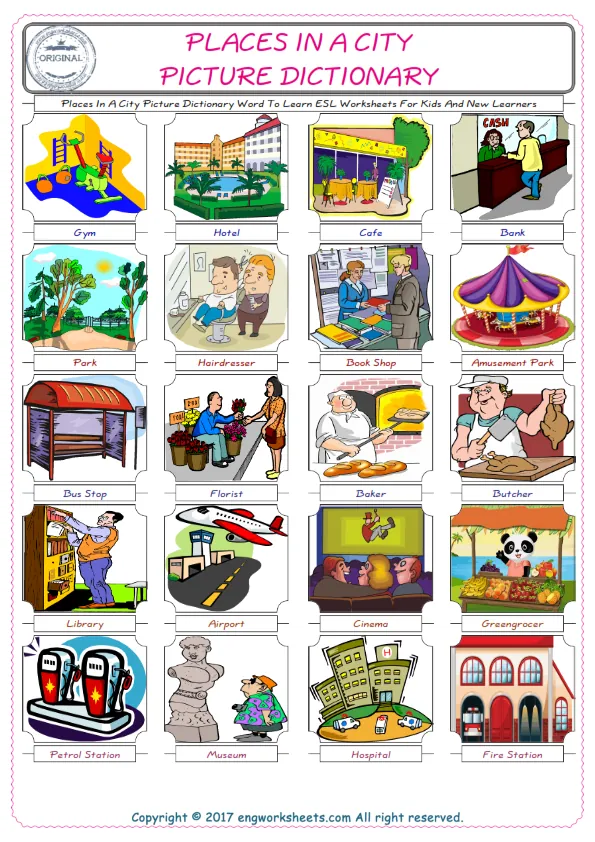 Places In A City English worksheets for kids and teachers special to learning Places In A City words. Places In A City ESL picture dictionary worksheets to improve vocabulary. Places In A City poster works to hang in your classroom. Check the picture and review the words and learn swiftly. By matching the words and pictures, you can make learning both fun and permanent. Our worksheets are very easy, convenient and fun in order to teach and learn the Places In A City words. Each of English worksheets you created is different to each other.