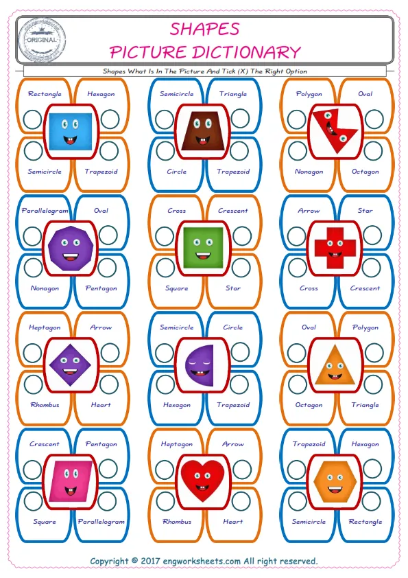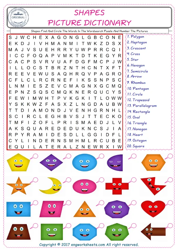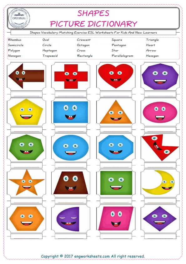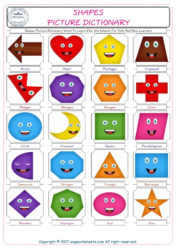 Shapes English worksheets for kids and teachers special to learning Shapes words. Shapes ESL picture dictionary worksheets to improve vocabulary. Shapes poster works to hang in your classroom. Check the picture and review the words and learn swiftly. By matching the words and pictures, you can make learning both fun and permanent. Our worksheets are very easy, convenient and fun in order to teach and learn the Shapes words. Each of English worksheets you created is different to each other.