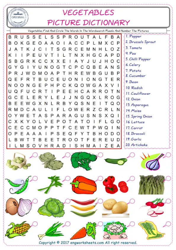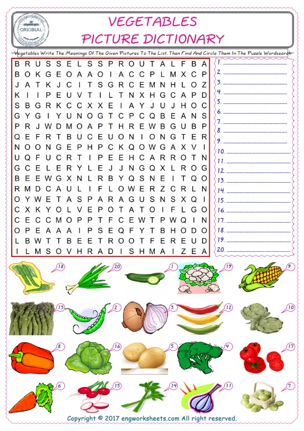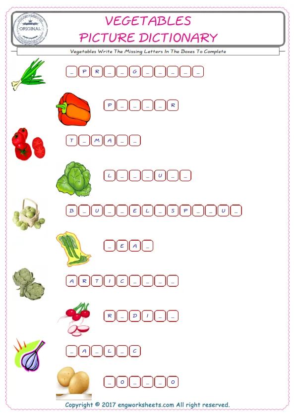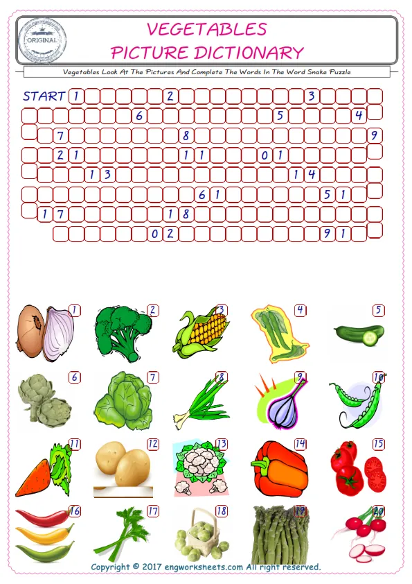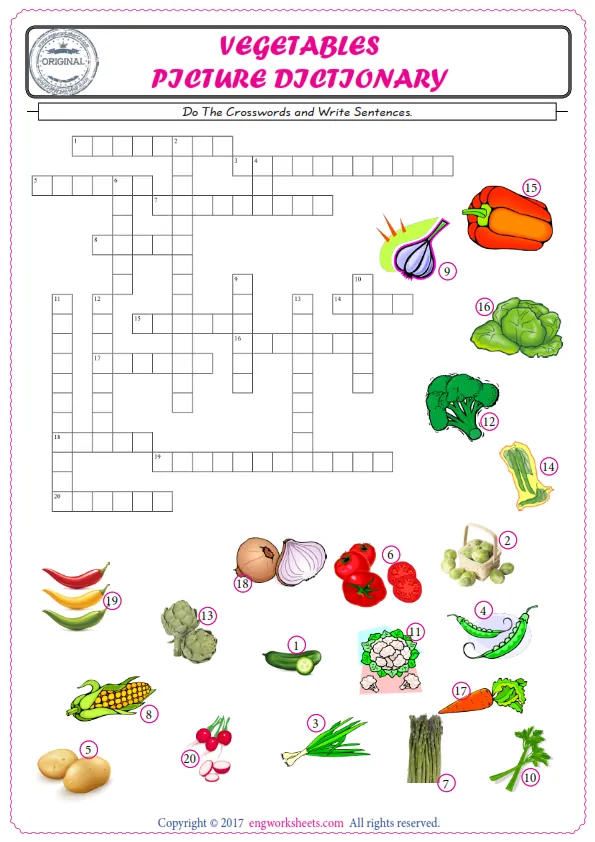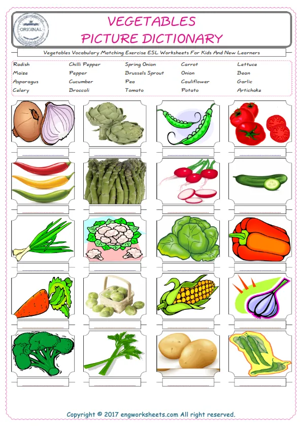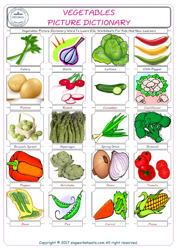 Vegetables English Worksheet for Kids ESL Printable Picture Dictionary