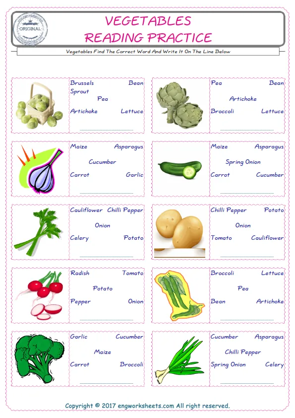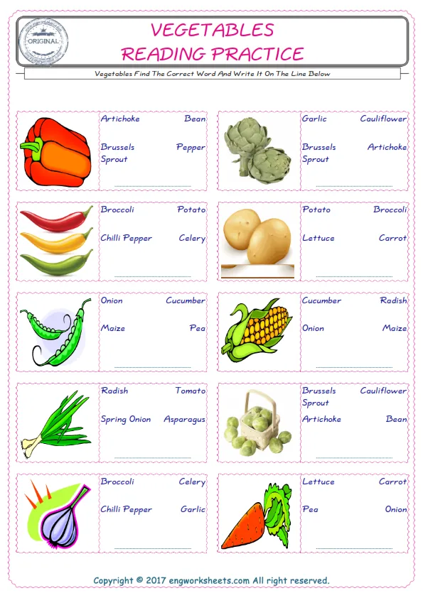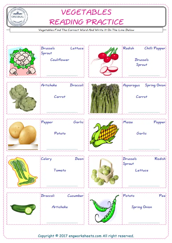 Vegetables English worksheets for kids and teachers special to learning Vegetables words. Vegetables ESL picture dictionary worksheets to improve vocabulary. Vegetables poster works to hang in your classroom. Check the picture and review the words and learn swiftly. By matching the words and pictures, you can make learning both fun and permanent. Our worksheets are very easy, convenient and fun in order to teach and learn the Vegetables words. Each of English worksheets you created is different to each other.