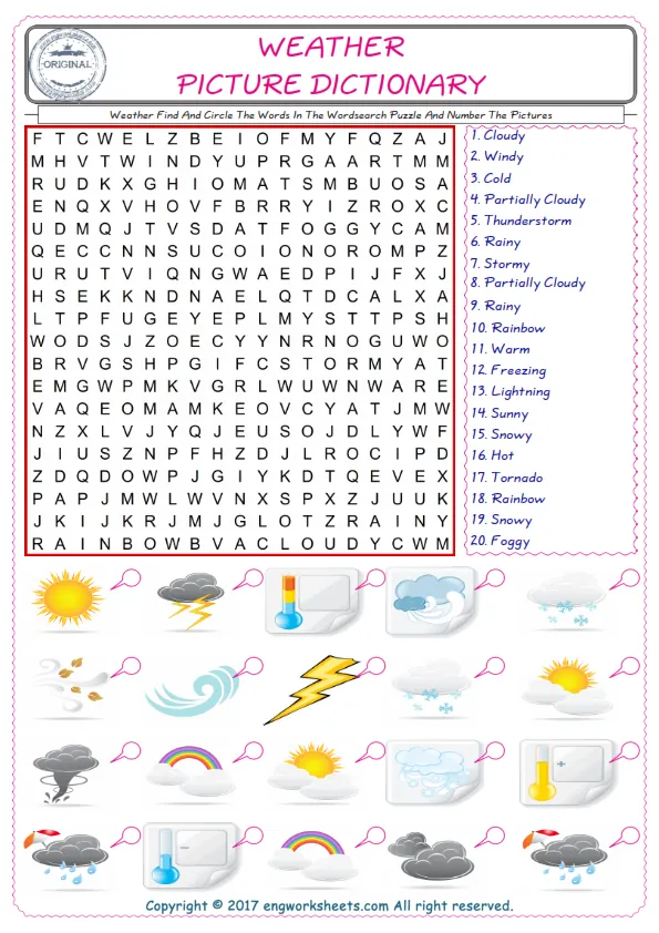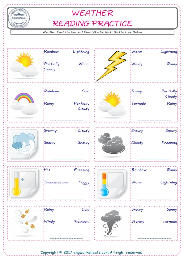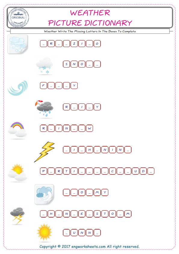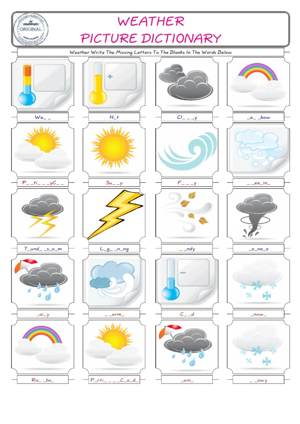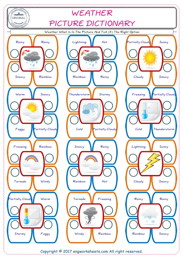 Weather English worksheets for kids and teachers special to learning Weather words. Weather ESL picture dictionary worksheets to improve vocabulary. Weather poster works to hang in your classroom. Check the picture and review the words and learn swiftly. By matching the words and pictures, you can make learning both fun and permanent. Our worksheets are very easy, convenient and fun in order to teach and learn the Weather words. Each of English worksheets you created is different to each other.
