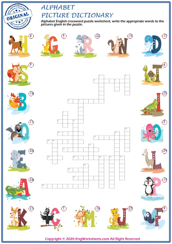 Our Alphabet-themed Illustrated Crossword Worksheet is a fun and engaging way to test your knowledge of English vocabulary related to the letters of the alphabet. With colorful illustrations and challenging clues, this worksheet is an excellent tool for practicing your alphabet-related vocabulary.