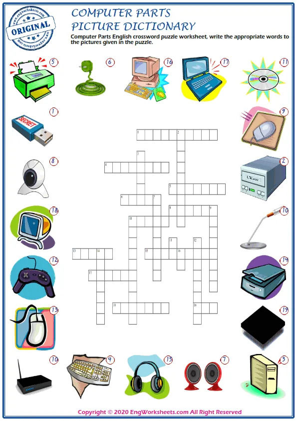 Our Illustrated Crossword Worksheet on Computer Parts is perfect for reinforcing vocabulary retention. It features colorful illustrations and clues related to various parts of a computer, such as the keyboard, mouse, and monitor, making it a fun and engaging way to learn.