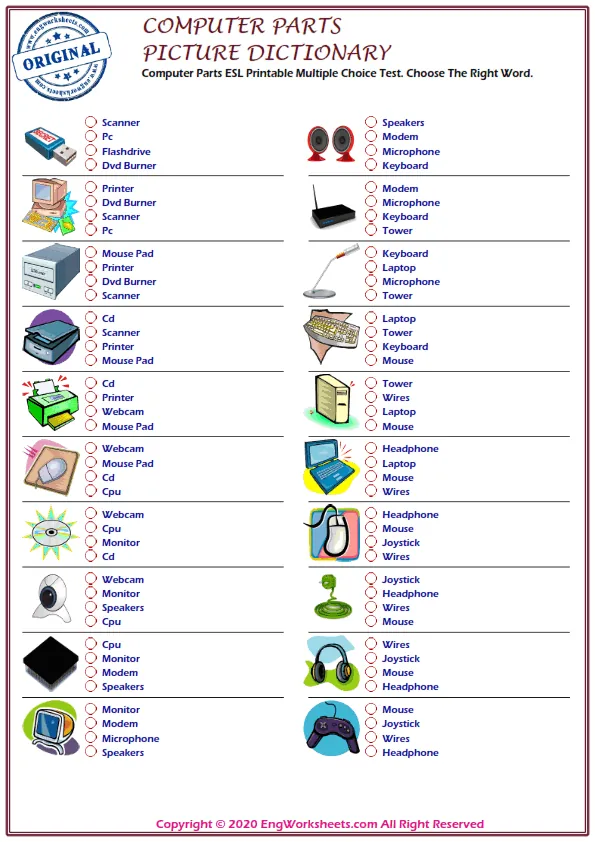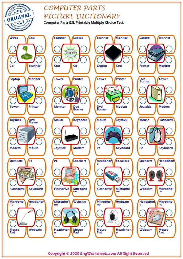 Finally, our ESL Vocabulary learning exercises and Multiple Choice English Tests on Computer Parts are designed to challenge learners at various proficiency levels. These worksheets cover a range of Computer Parts-related vocabulary and grammar concepts, making them a comprehensive resource for learners of all levels.
