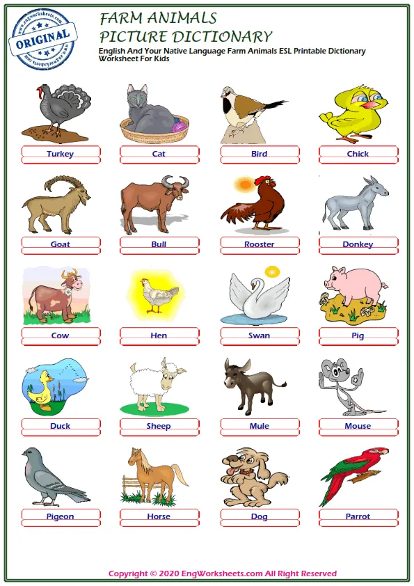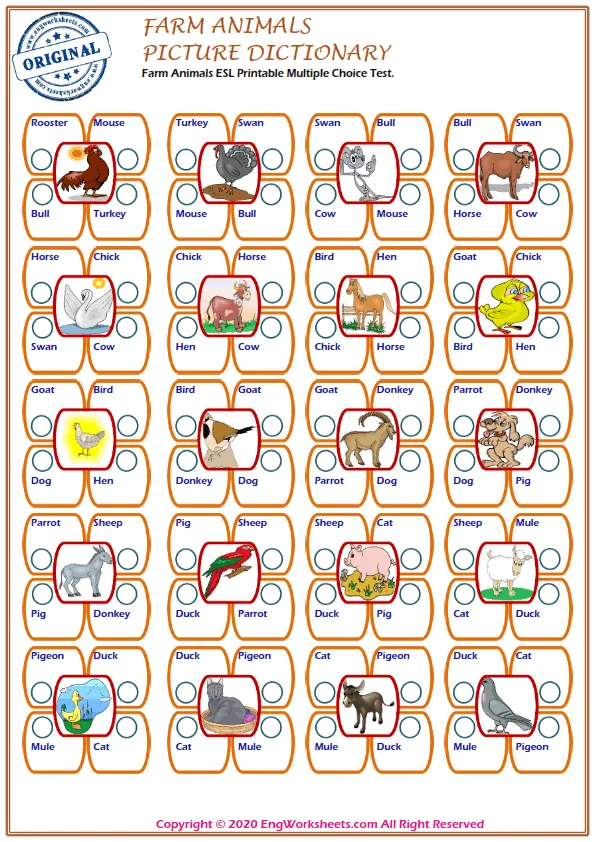 Finally, we also offer multiple-choice English tests that assess students' comprehension of farm animal vocabulary and related concepts. These tests can be used as quizzes or assessments to measure progress over time.