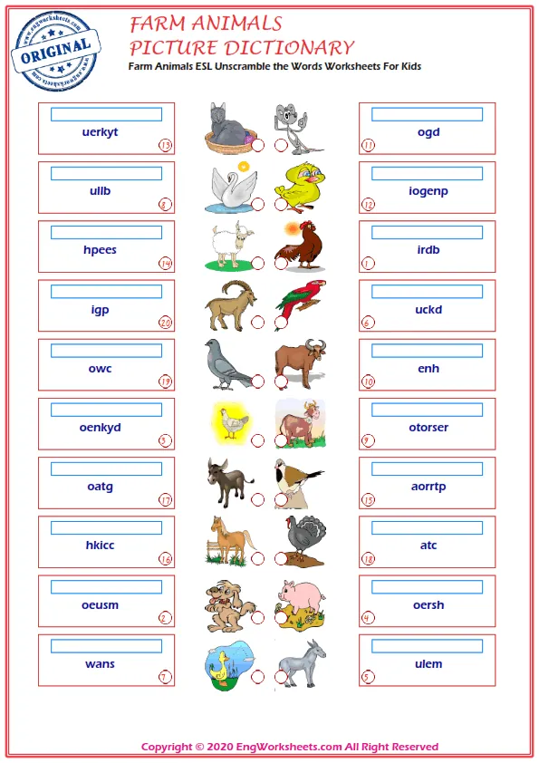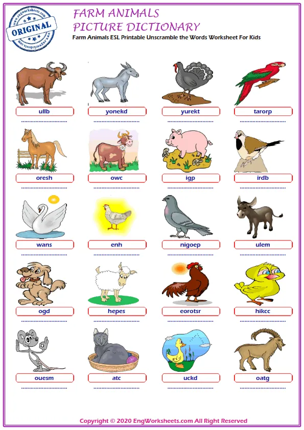 Our activities for finding mixed words can be used to test students' understanding of farm animal-related vocabulary in a fun and interactive way. These exercises involve jumbled words that must be unscrambled to form the correct farm animal term.