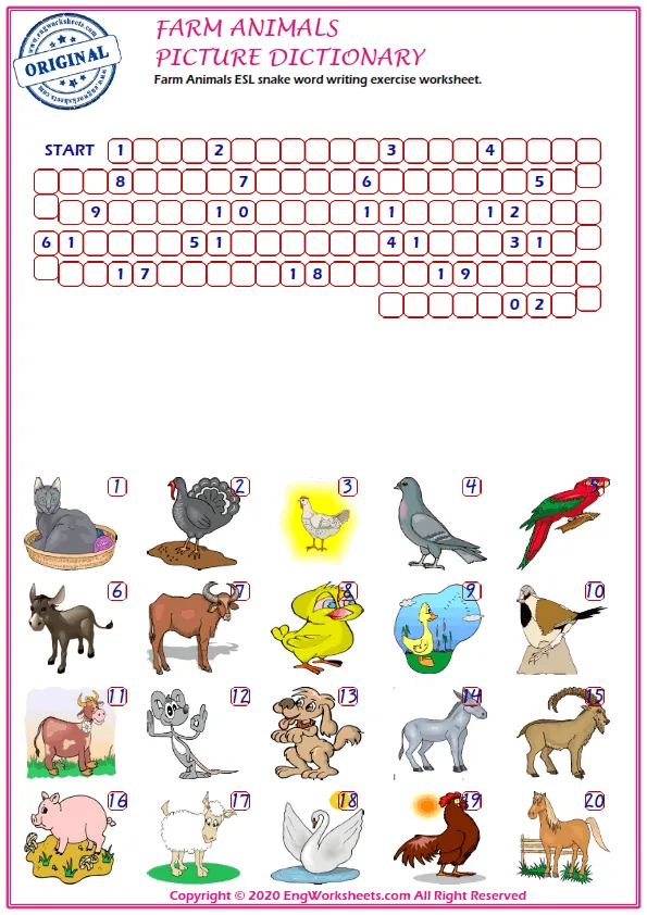 Our word search puzzle and word snake puzzle worksheets are both popular choices for students who enjoy puzzles and games. These worksheets feature a variety of farm animal-related words hidden within a grid or snaking around a page that students must find.
