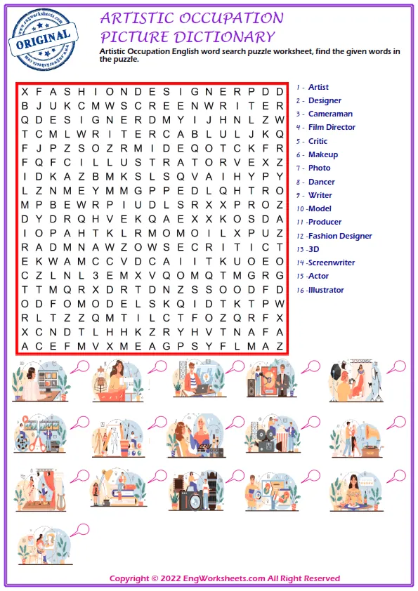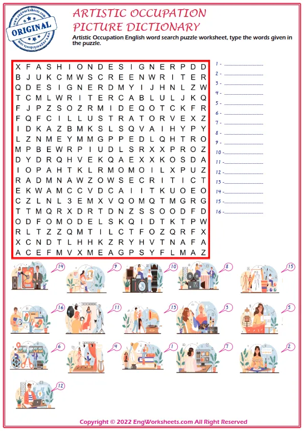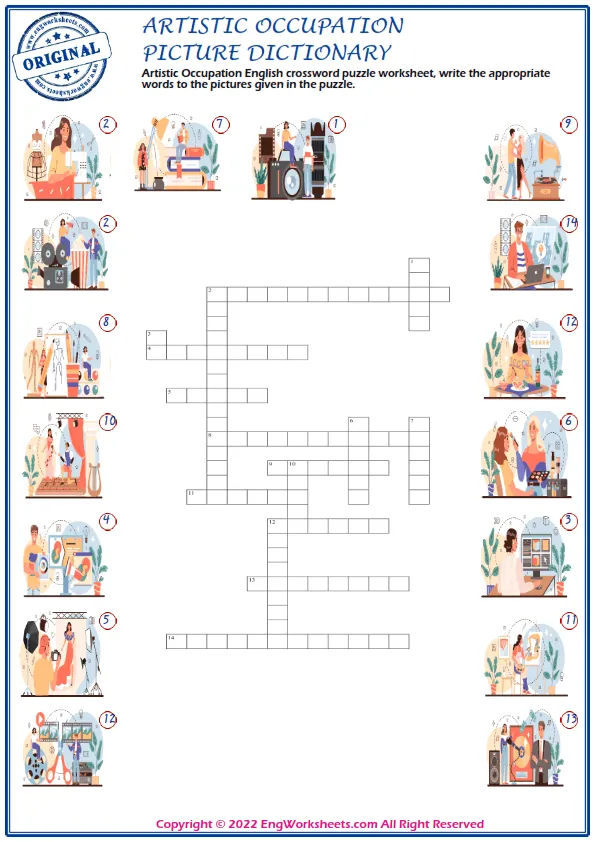 Our Artistic Occupation-themed Illustrated Crossword Worksheet is a fun and interactive way for kids to learn new words related to Artistic Occupation. It features colorful illustrations and challenging clues that help your child to practice and reinforce their understanding of Artistic Occupation-related vocabulary.
