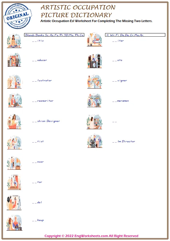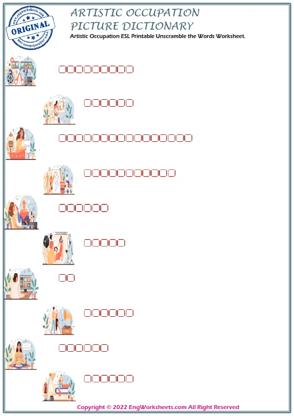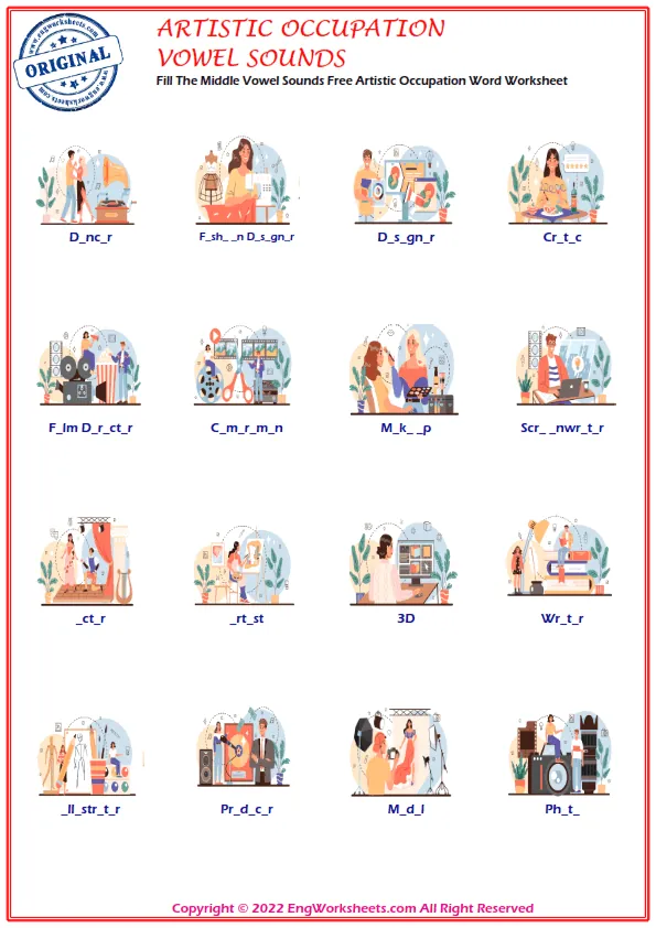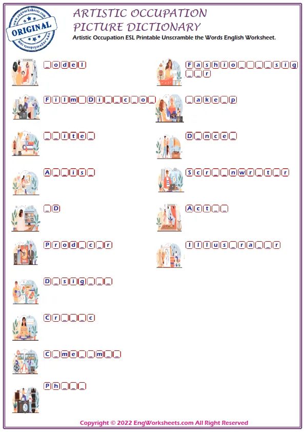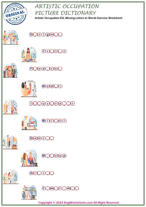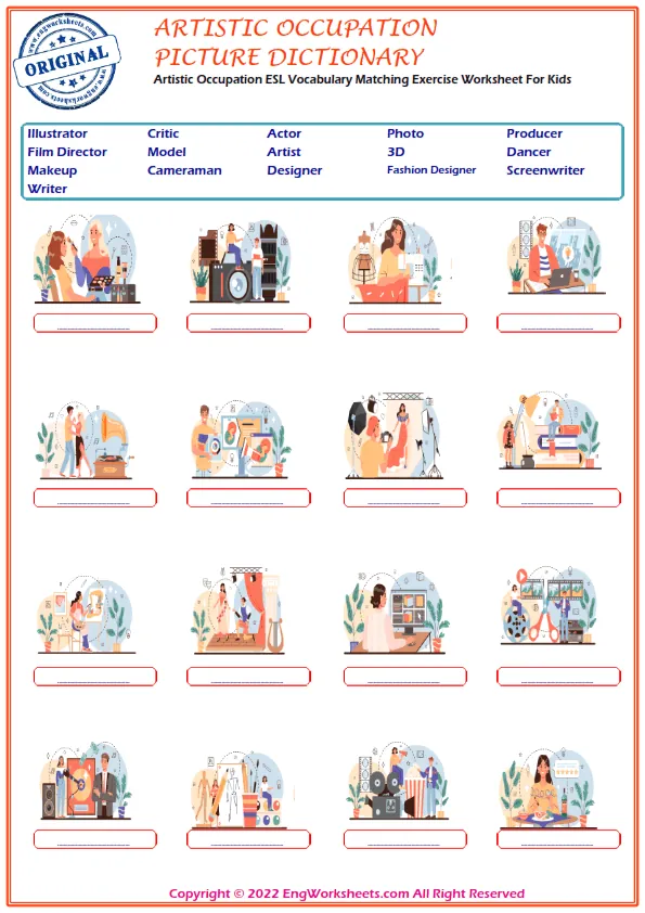 For a more challenging Artistic Occupation-related exercise, our Missing English Word Completion Worksheets or Word Matching Exercise Worksheet can help. These exercises require kids to fill in the blanks or match Artistic Occupation-related words, allowing them to test their knowledge in a more advanced way.