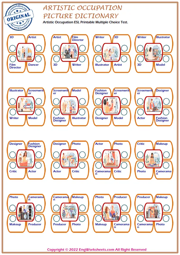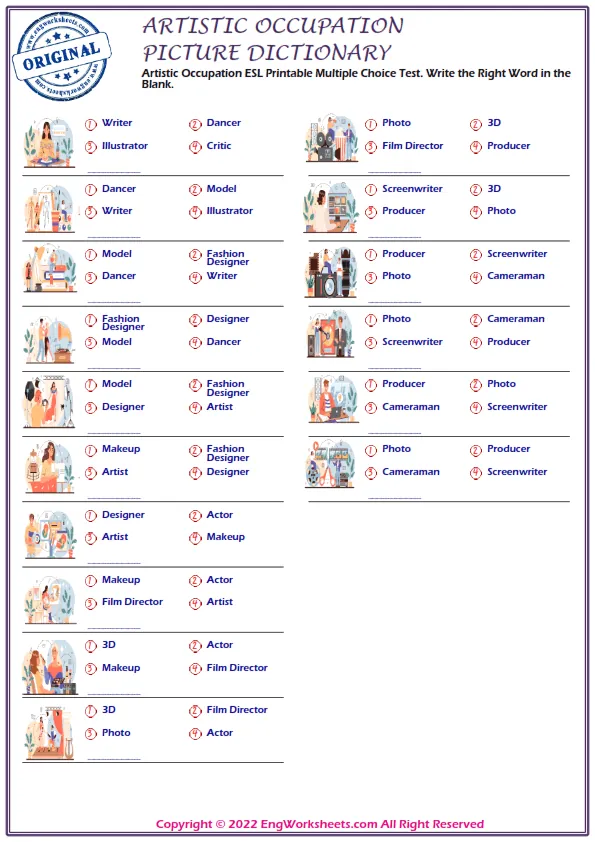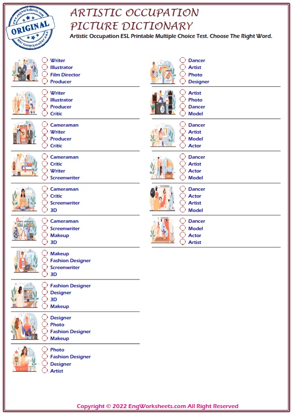 Finally, our Multiple Choice English Tests are a great way to test your child's Artistic Occupation-related vocabulary knowledge in a more formal setting. With a variety of questions and levels, these tests are an effective tool for assessing your child's progress and identifying areas for improvement.