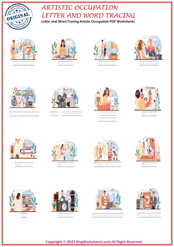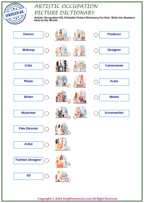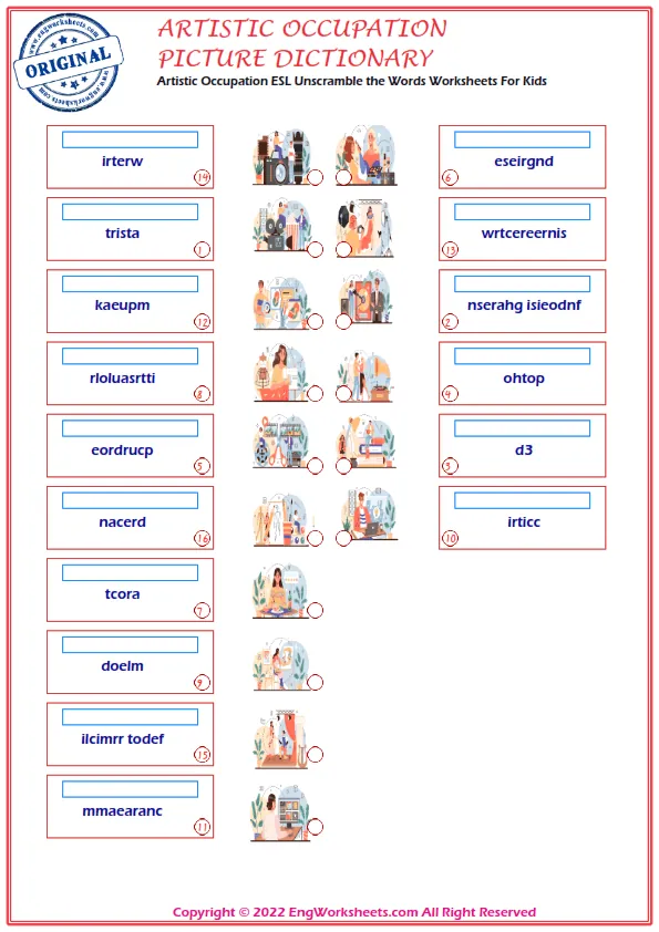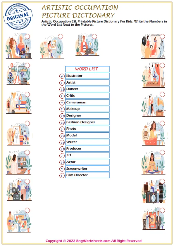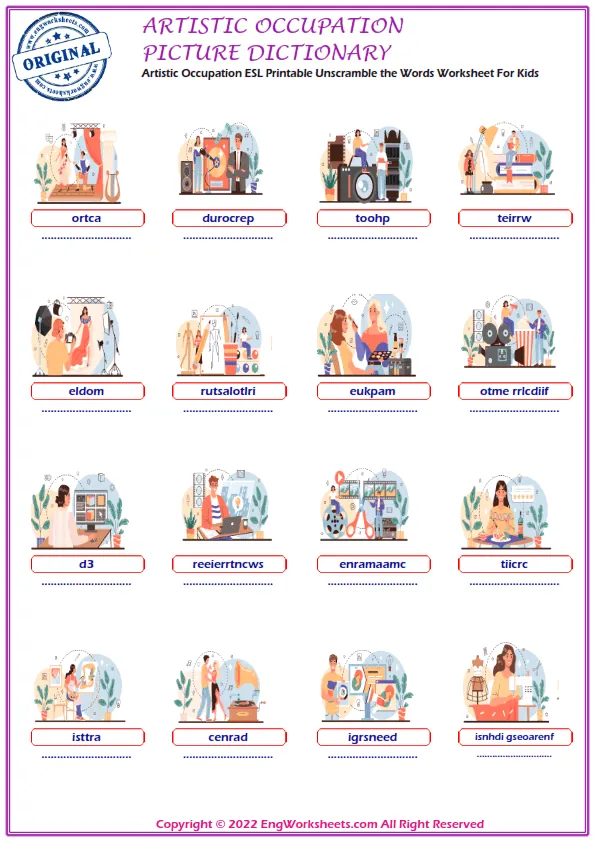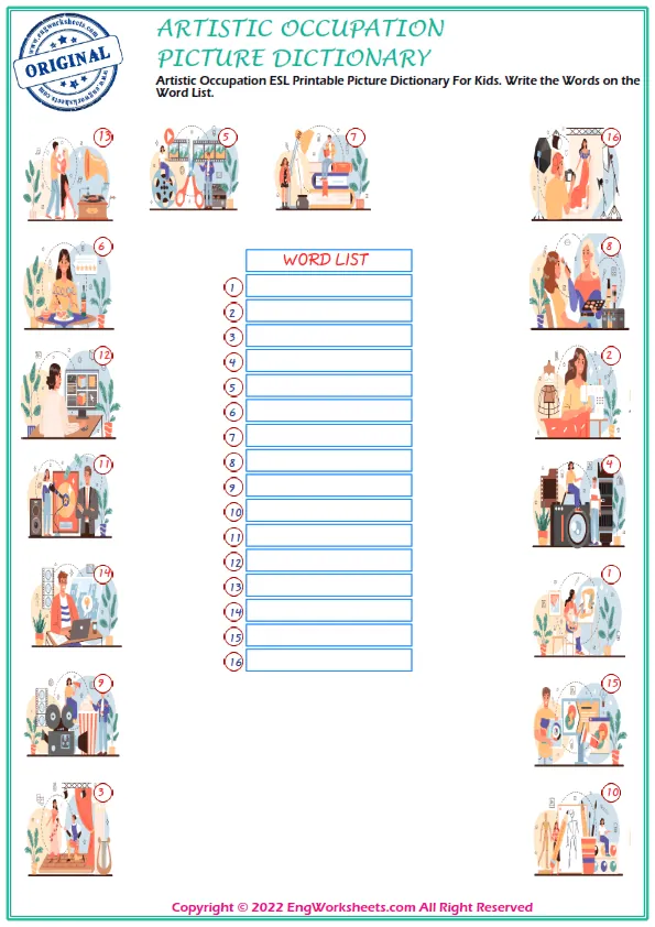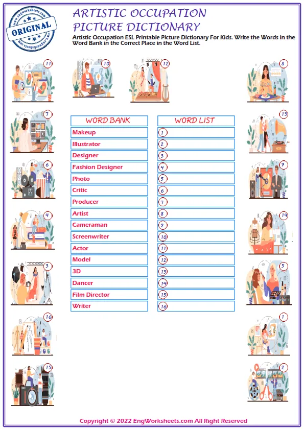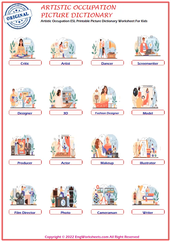 Artistic Occupation is a fascinating field, and it is important for kids to understand the vocabulary associated with it. At our site, we offer a range of free printable English ESL vocabulary worksheets that are perfect for improving your child's language skills related to Artistic Occupation.
